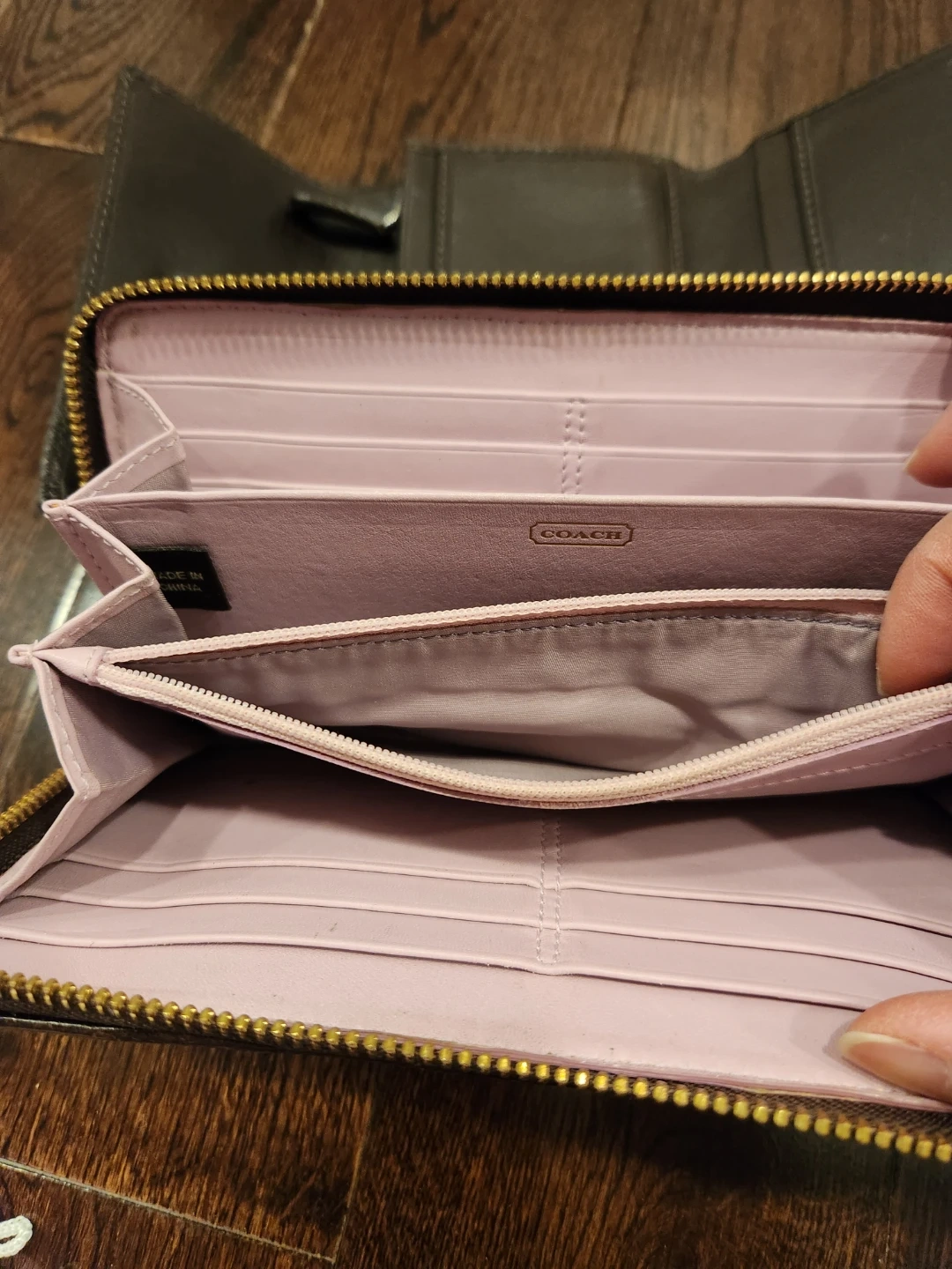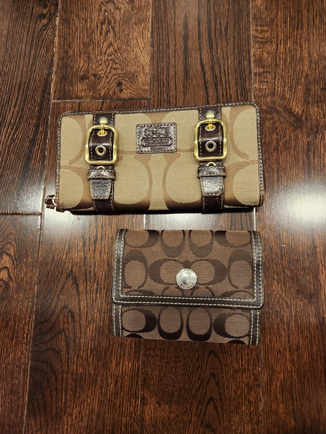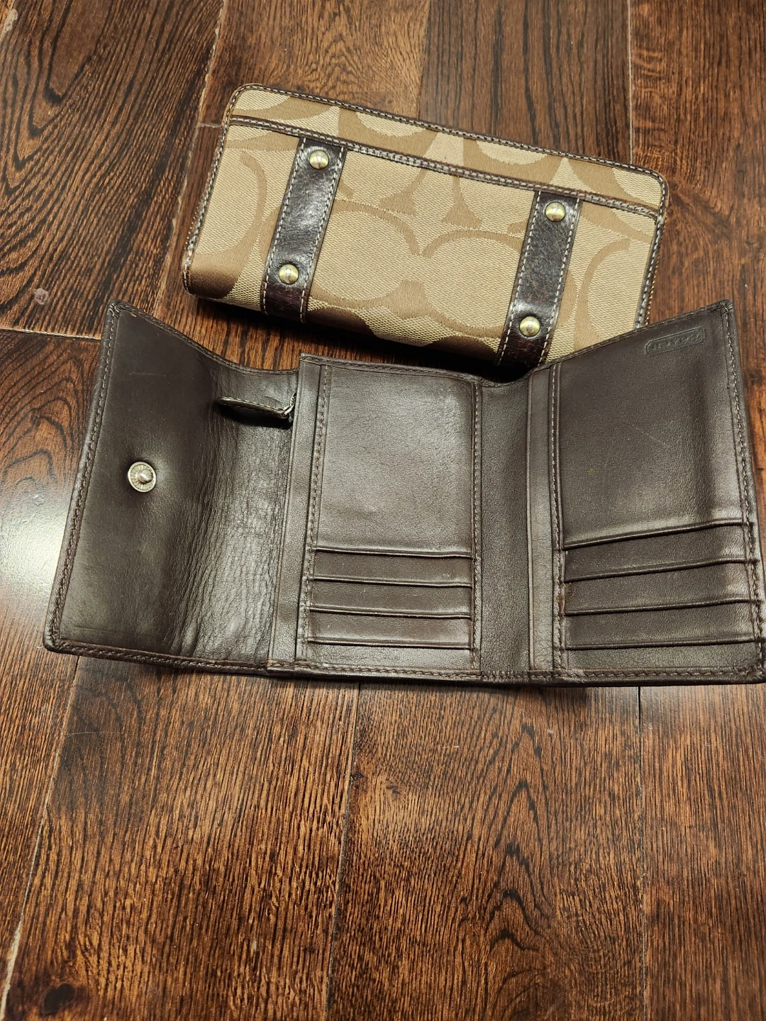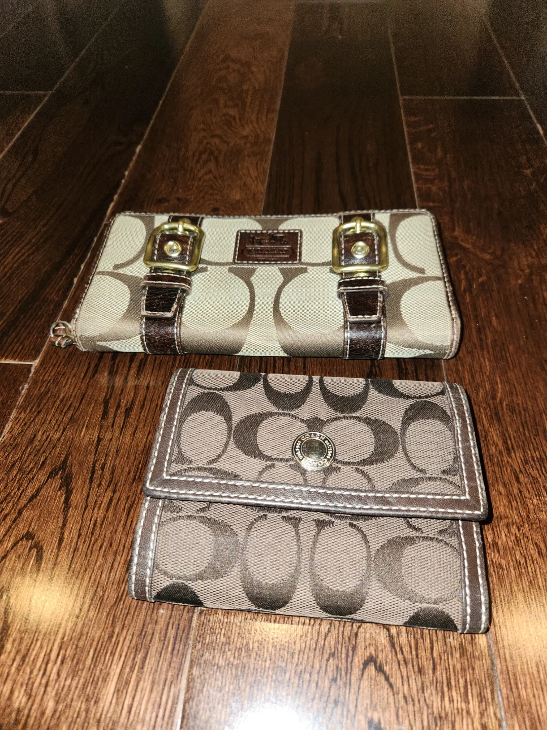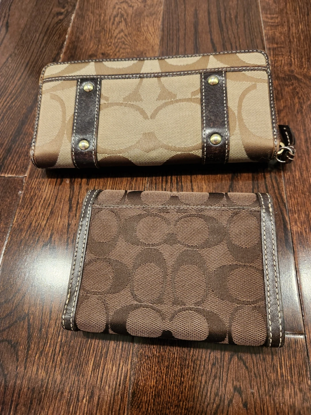 Two Coach signature C logo wallets in brown. Includes a larger zip-around wallet and a smaller bifold wallet. Both are made of coated canvas with leather trim and interior.