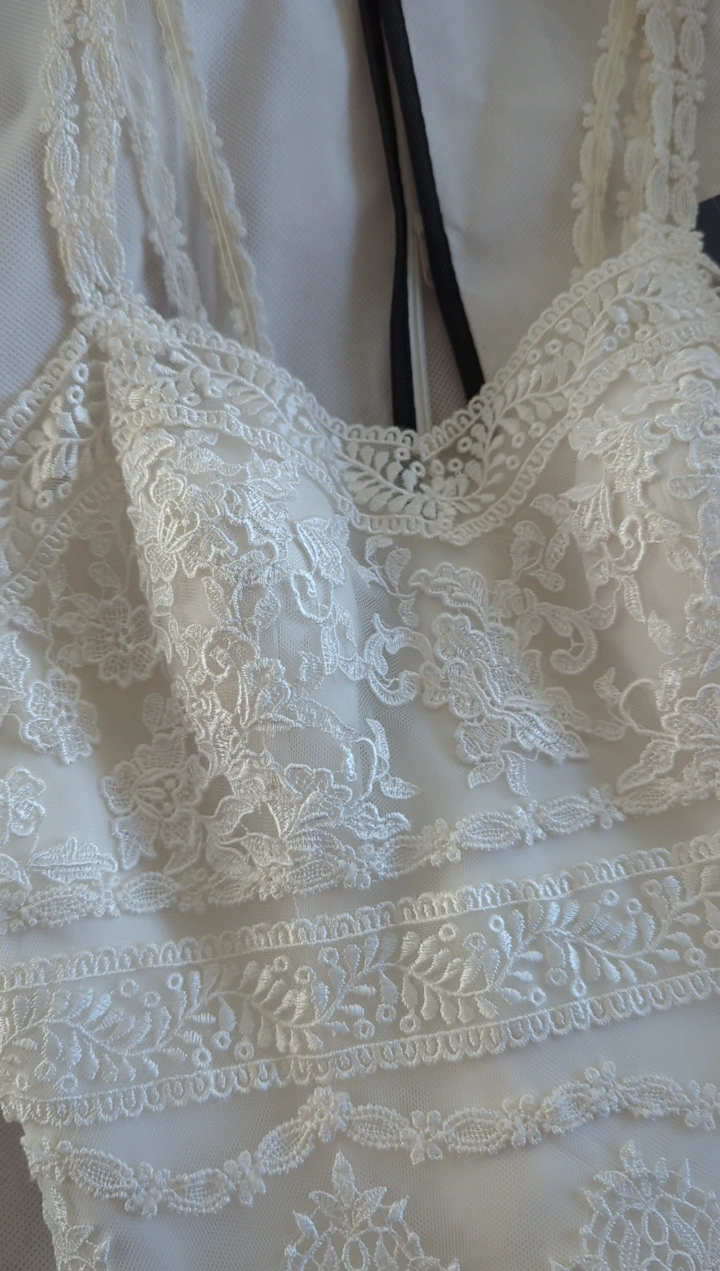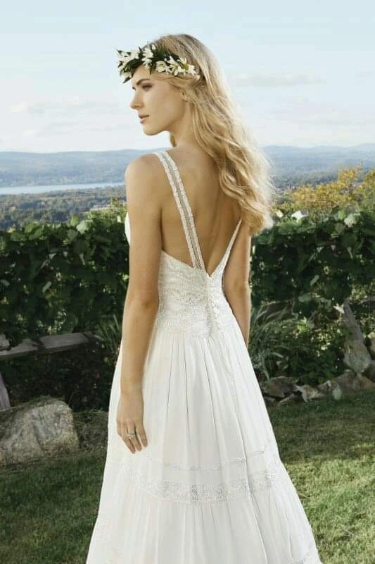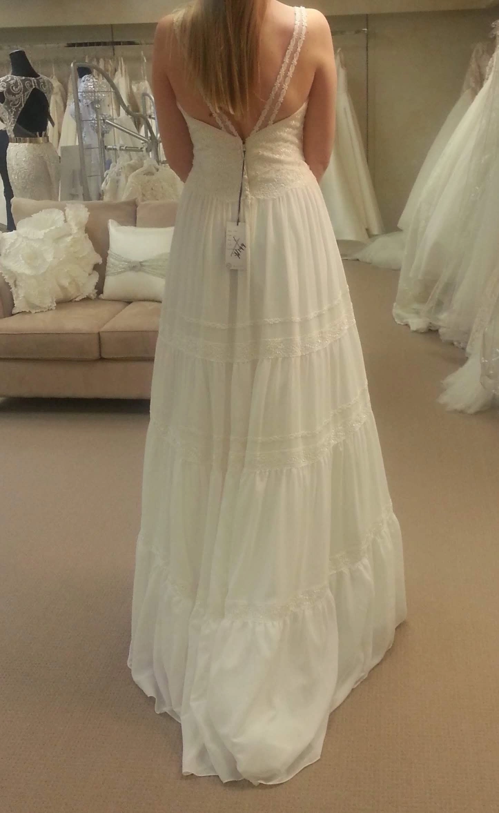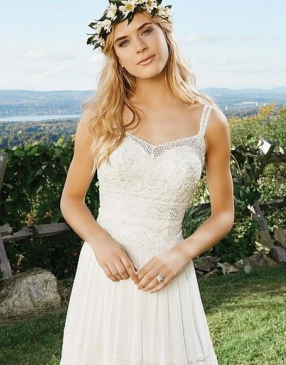 The horizontal lace patterns of the skirt of chiffon A-Line gown give it a flowy feel. The dress is accentuated by lace straps and a dropped waist.