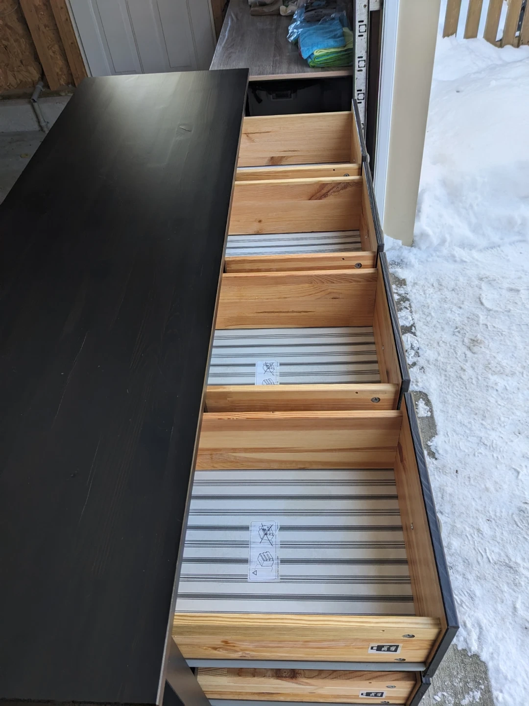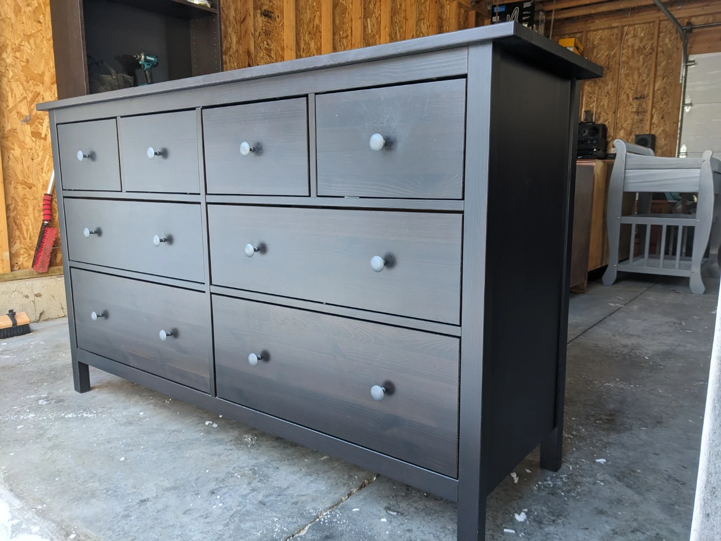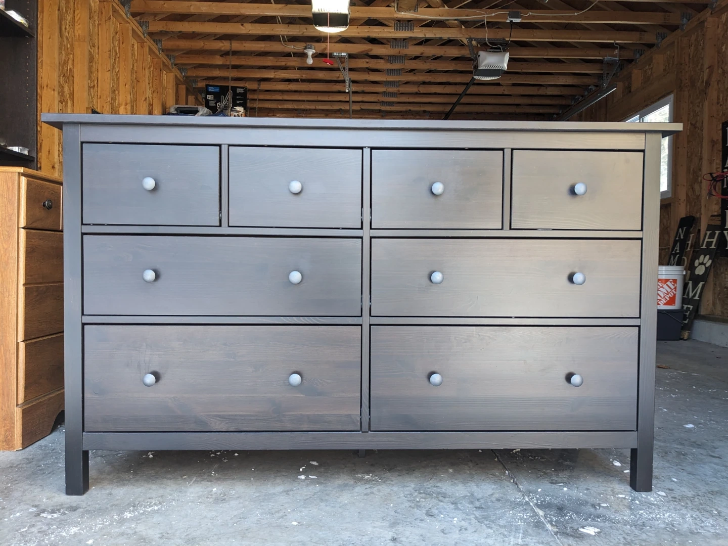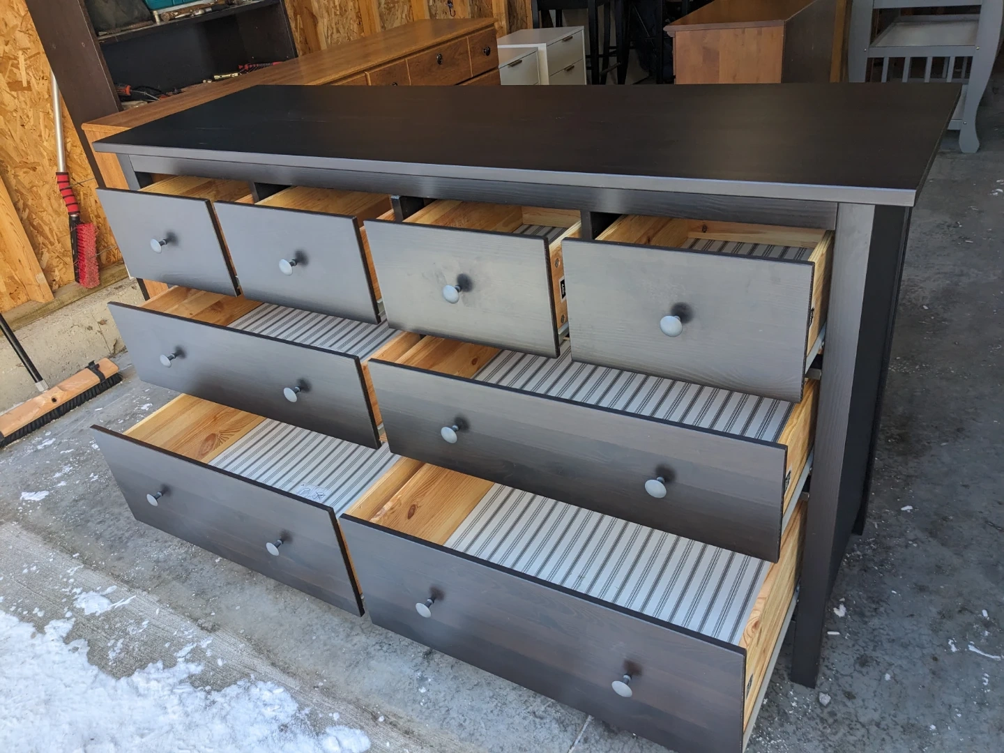 This Ikea Hemnes dresser in black-brown features 8 spacious drawers that all open and close perfectly on their modern metal slides with security stops. The drawer interiors are all in great condition and are lined with the Hemnes signature grey pinstriping.