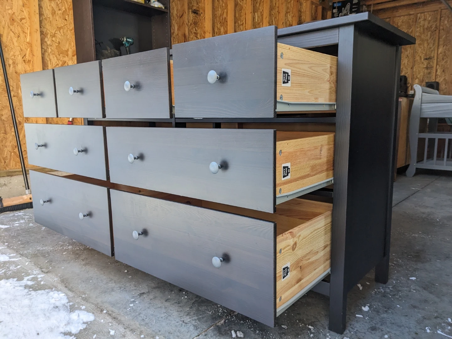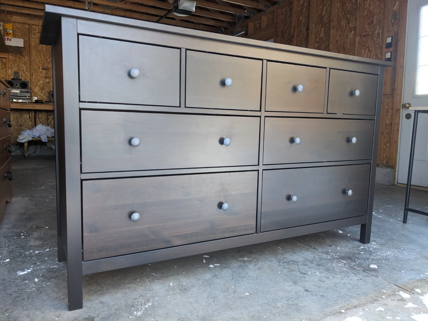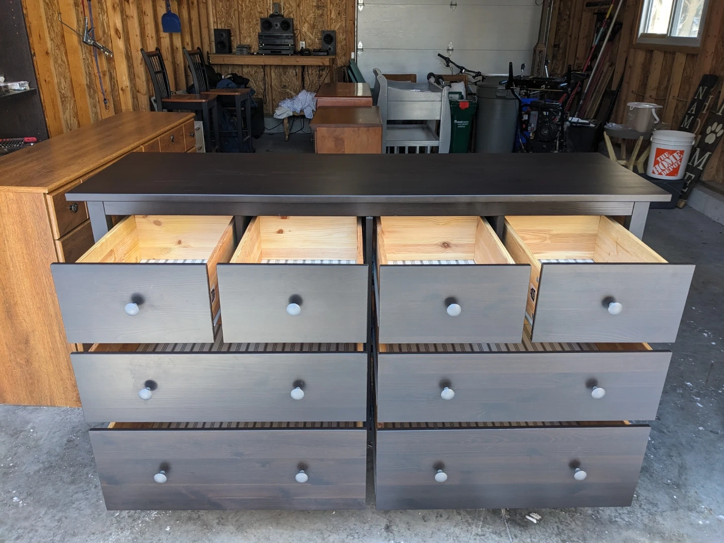 This Ikea Hemnes dresser in black-brown features 8 spacious drawers that all open and close perfectly on their modern metal slides with security stops. The drawer interiors are all in great condition and are lined with the Hemnes signature grey pinstriping.