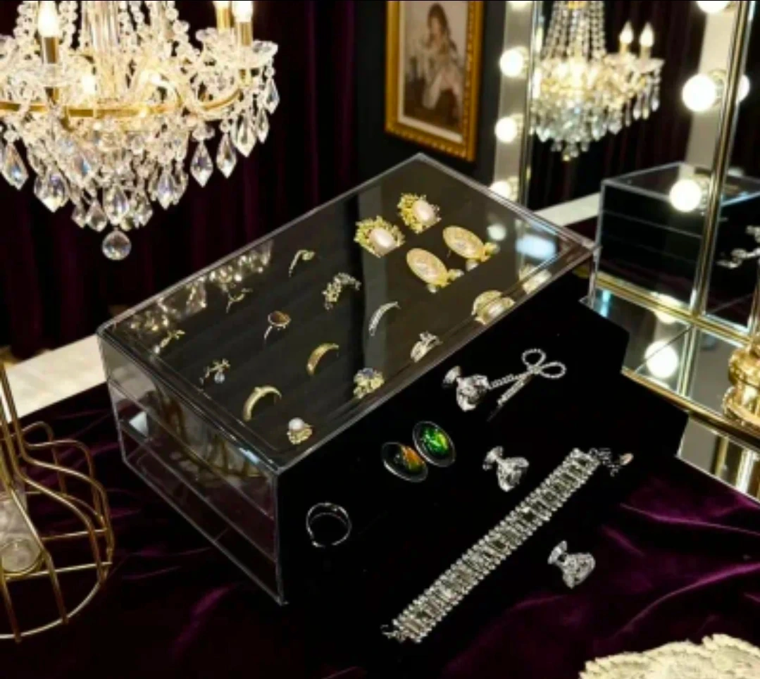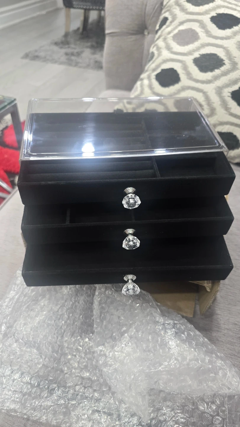 Keep your jewelry neatly organized with this lovely jewelry box! It features 3 layers of drawers to store your rings, necklaces, earrings, and other accessories. The clear top lets you easily see your collection, and the crystal-style knobs add a touch of elegance