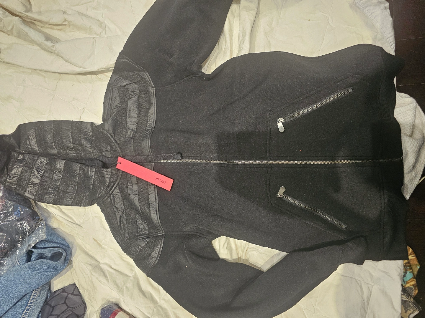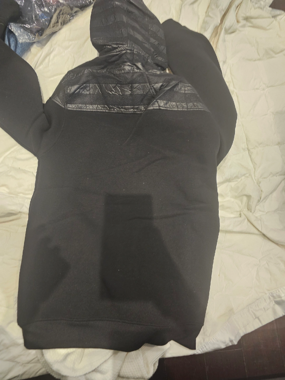 60Selling a Cecile black full zip hoodie. It's in great condition and features a unique design with quilted detailing on the hood and shoulders. Perfect for staying warm and stylish on cooler days