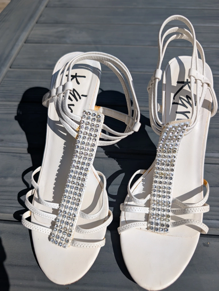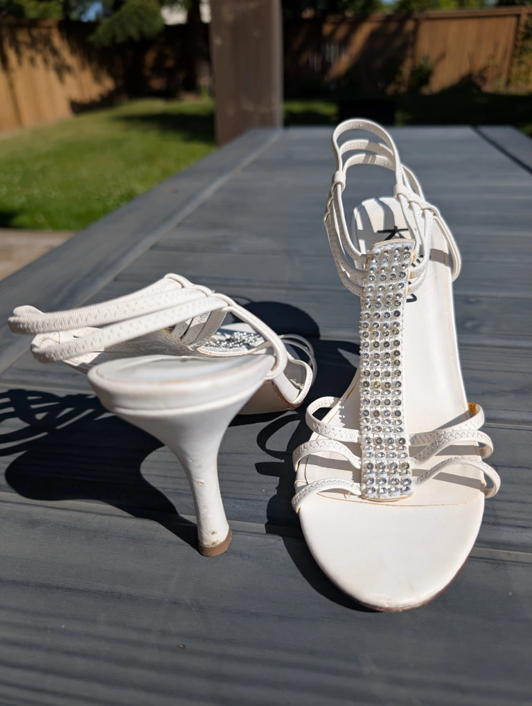 Selling a pair of Kimchi Blue heels in size 8. They're white with a sparkly rhinestone detail. They have some signs of wear but are still in good condition!