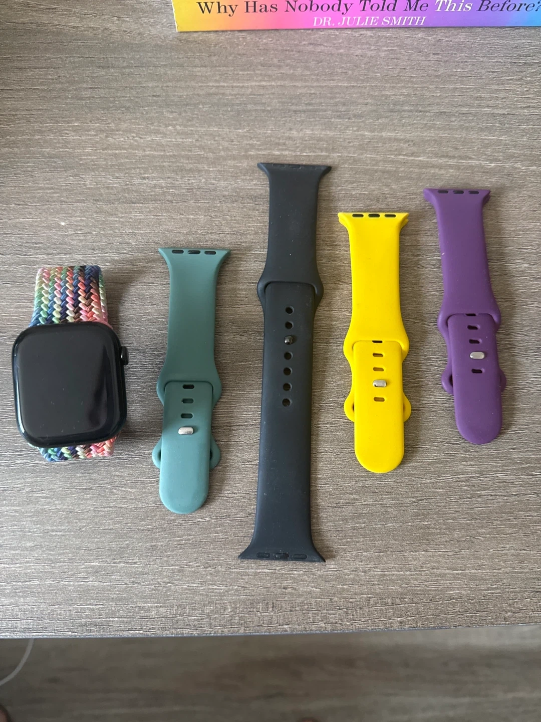 This is an Apple Watch Series 10 (GPS) in black. It comes with four additional watch bands in various colours: teal, black, yellow, and purple. The watchOS is version 26.3.