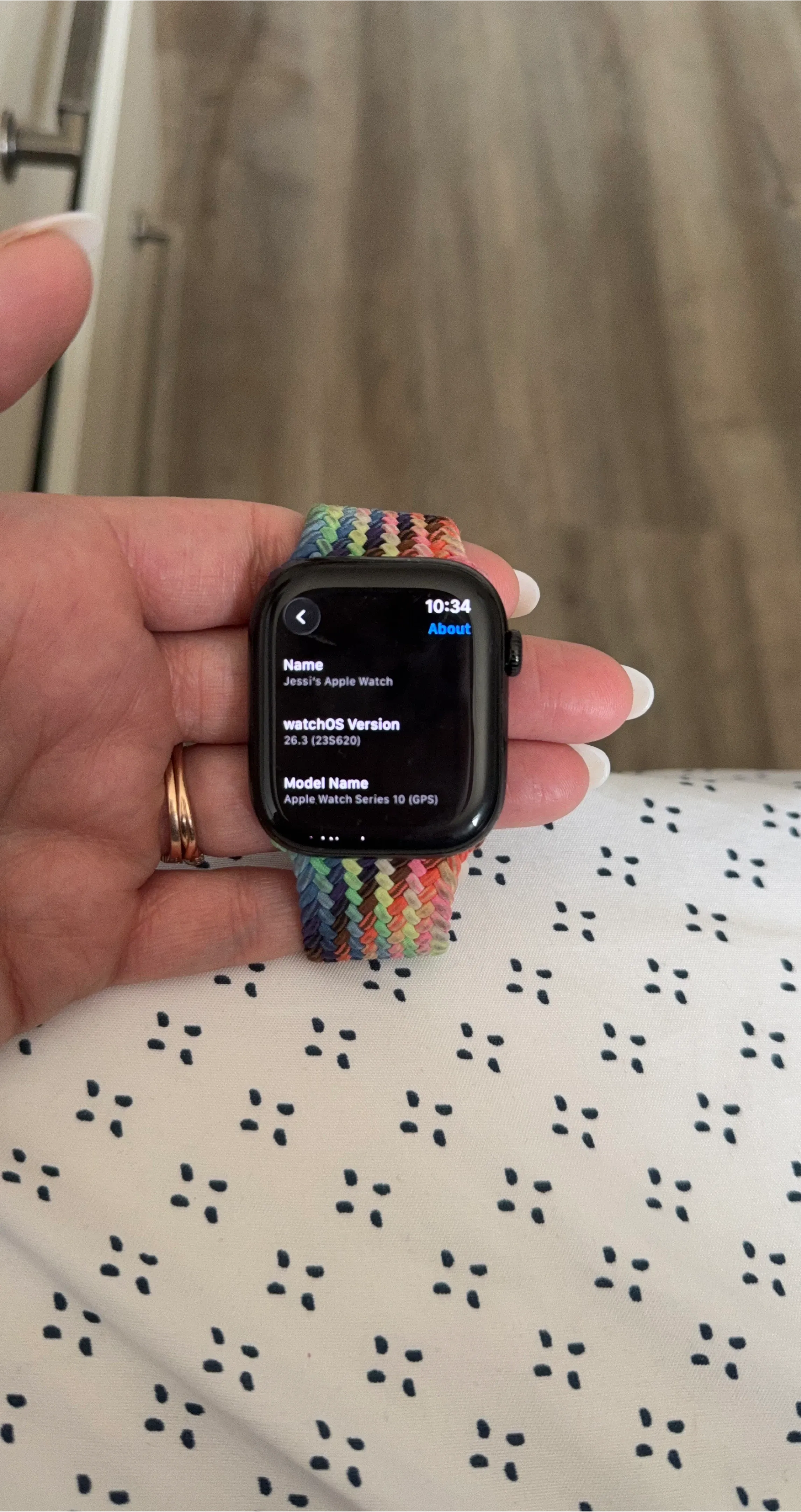 This is an Apple Watch Series 10 (GPS) in black. It comes with four additional watch bands in various colours: teal, black, yellow, and purple. The watchOS is version 26.3.