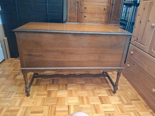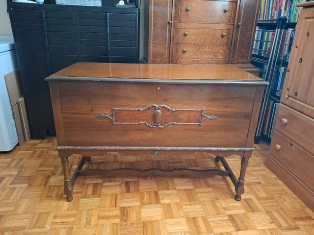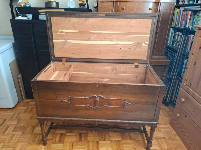 This is a beautiful, vintage cedar chest with unique detailing, perfect for storing blankets or linens. This used chest features a lift-top design, offering ample storage space while adding a touch of antique charm to any room. The item has some wear, consistent with its age, but remains a functional and attractive piece. Here are some details: * Exterior dimensions: 46 inches wide, 19 inches deep, and 25 inches high * Interior: Cedar lined * Style: Antique/Vintage I am pricing this chest at $125 or best offer. If the ad is up, it's still up for grabs!