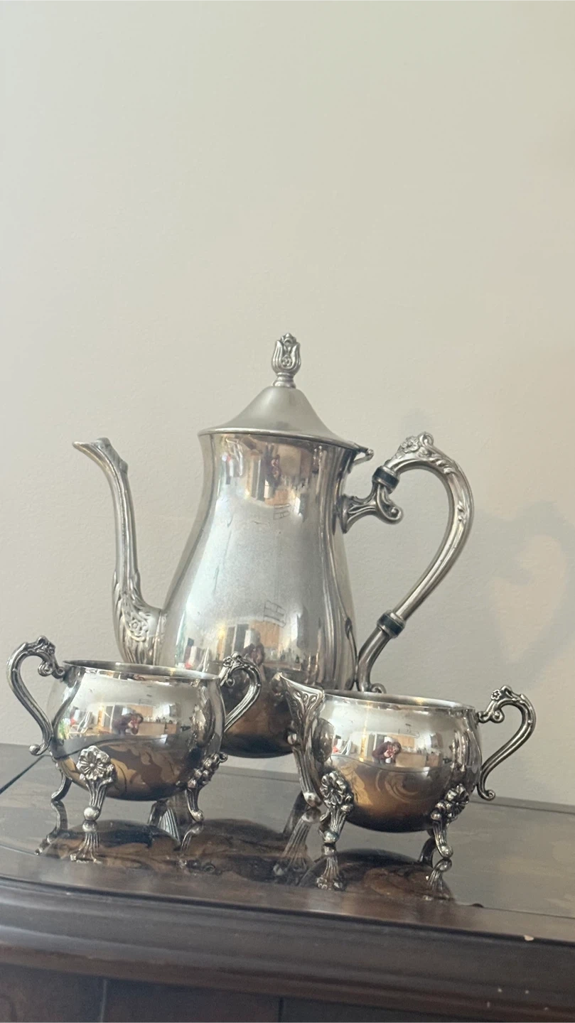 This elegant three-piece set includes a coffee pot, creamer, and sugar bowl. It's silver plated and made in Hong Kong. Perfect for serving guests or special occasions!