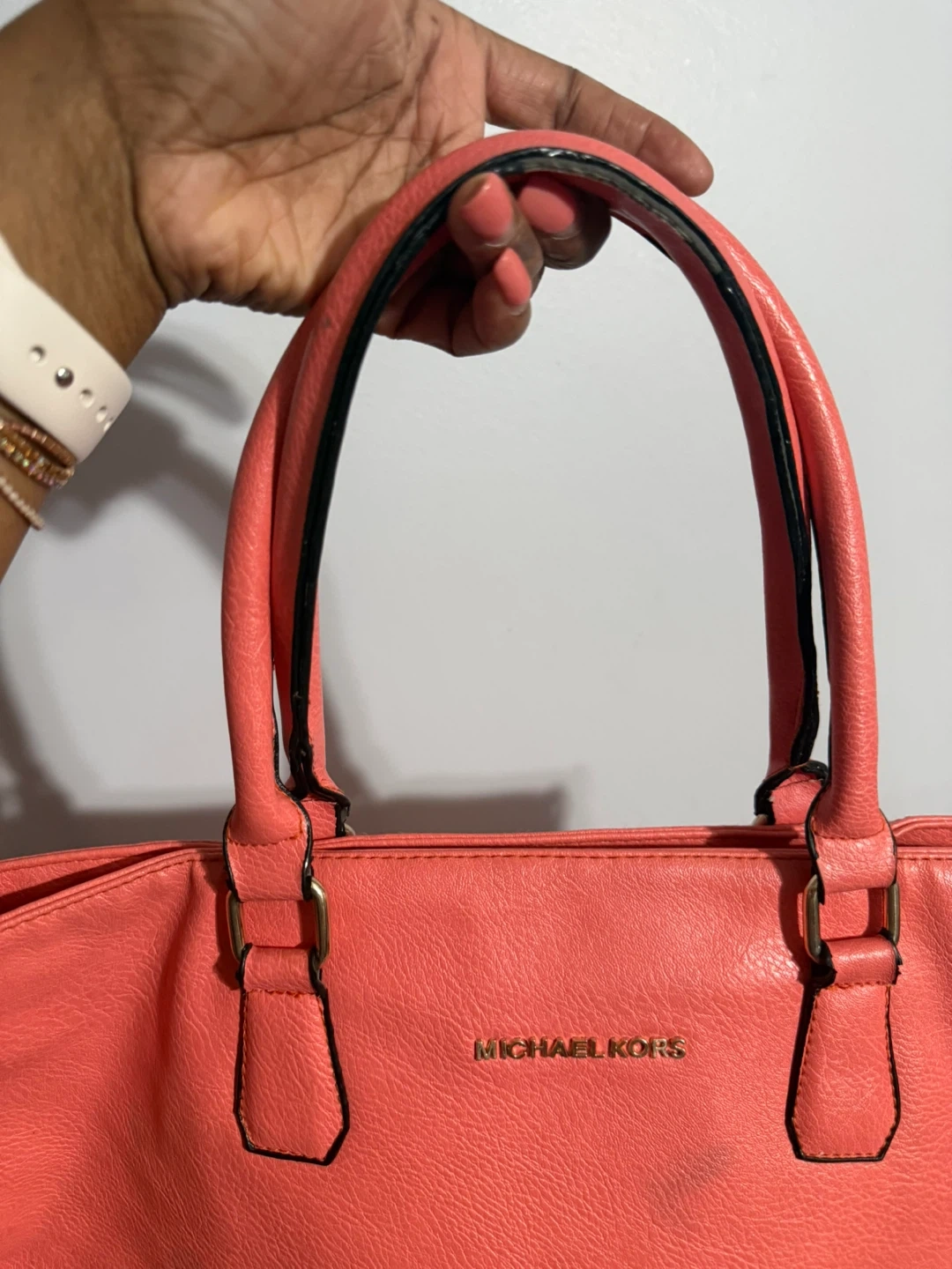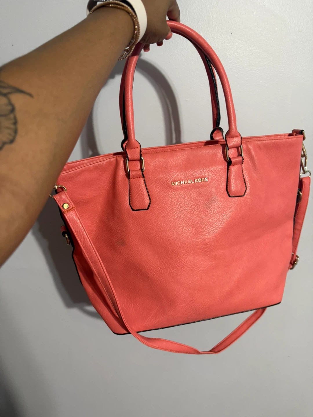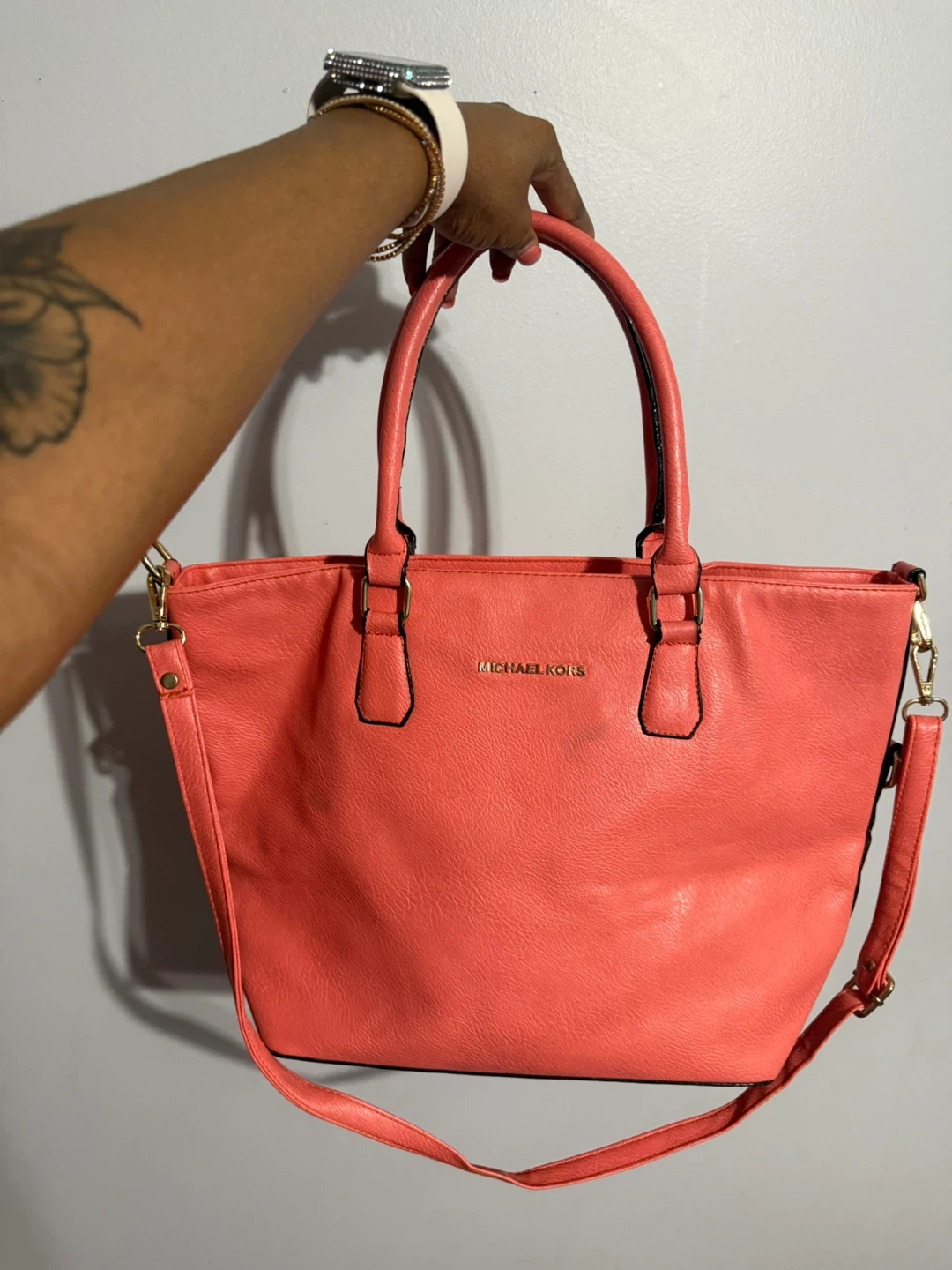 Michael Kors tote handbag in a coral pink color. It has dual top handles and a detachable shoulder strap. The interior is spacious for your essentials.