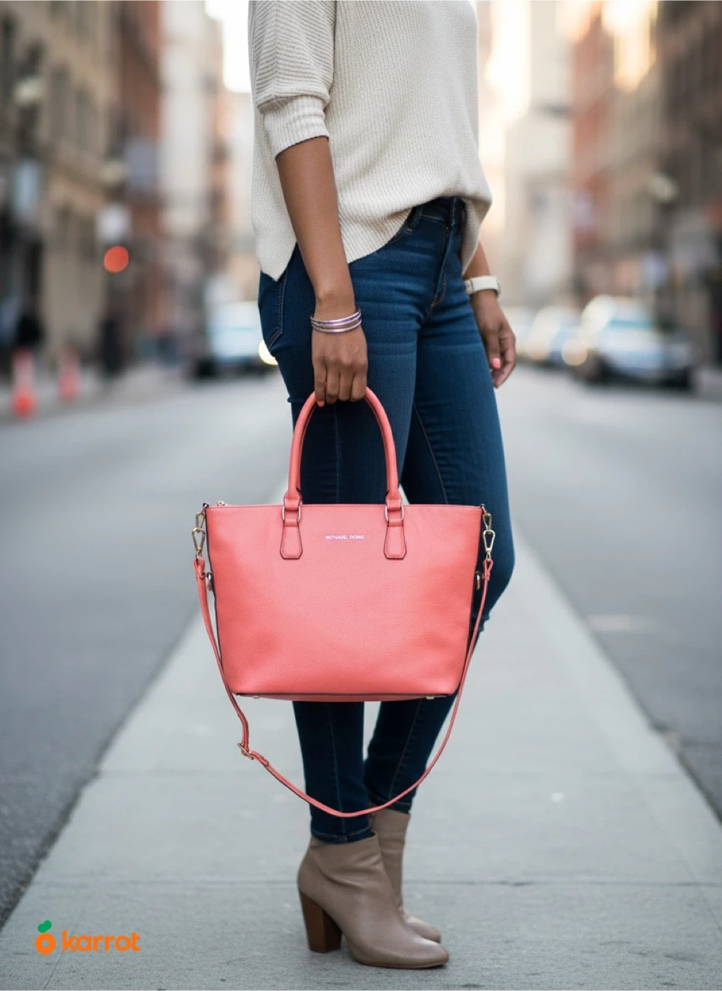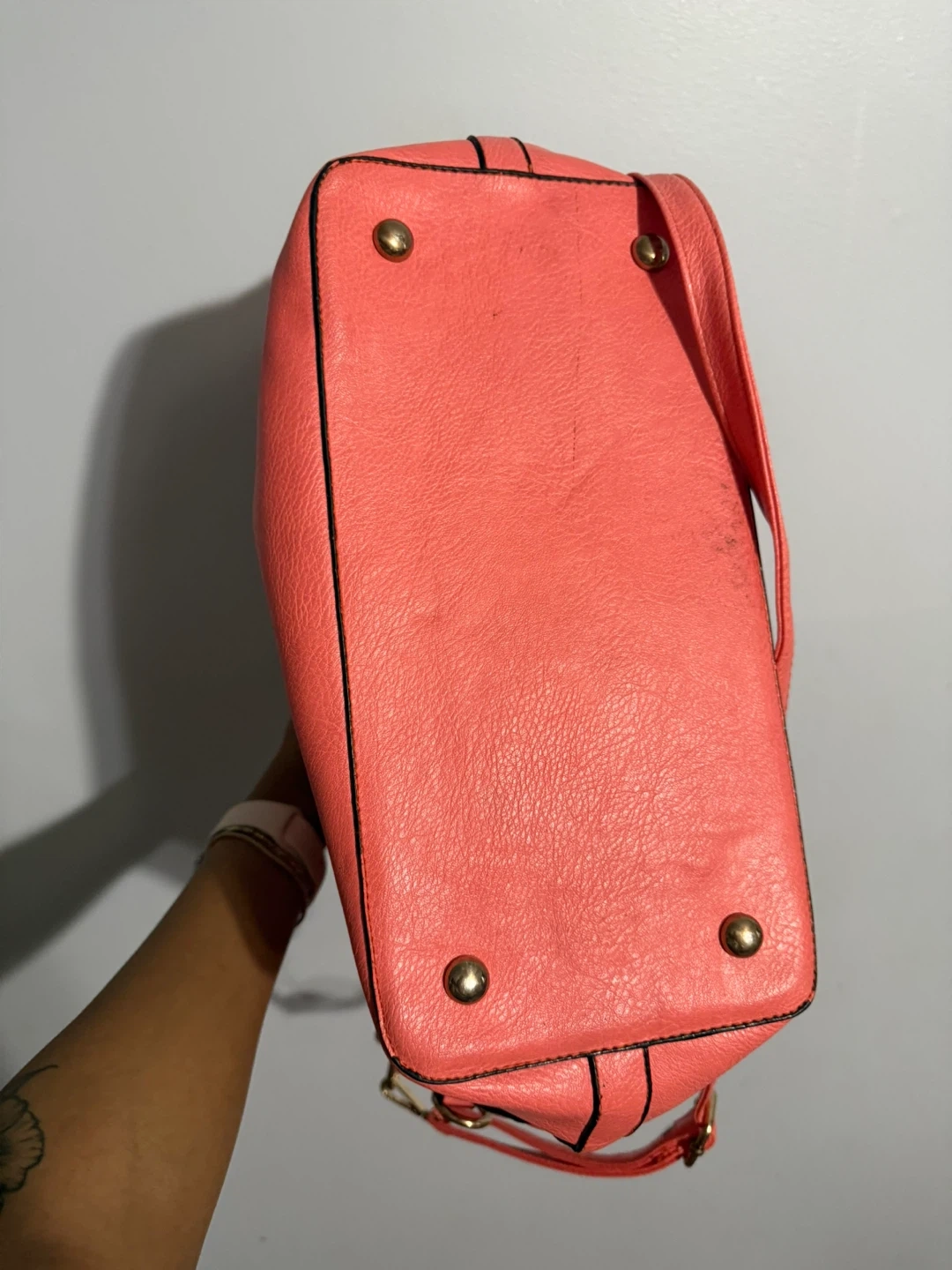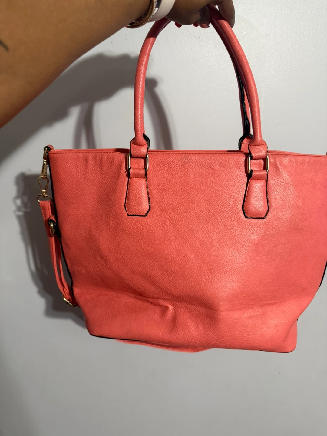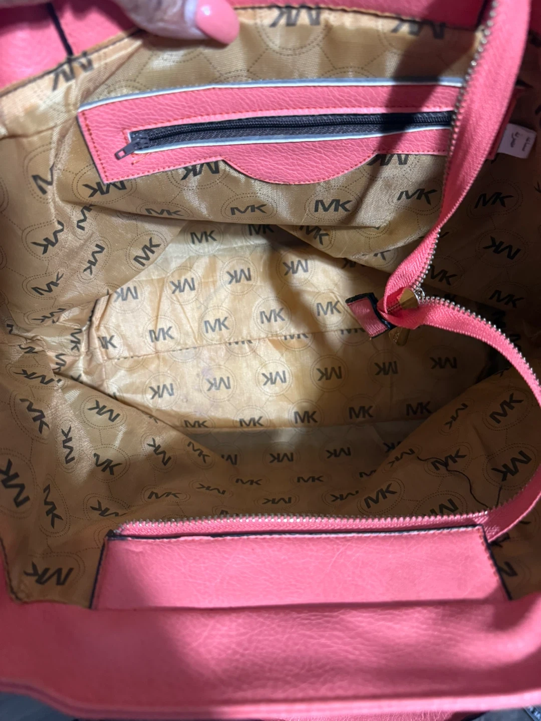 Michael Kors tote handbag in a coral pink color. It has dual top handles and a detachable shoulder strap. The interior is spacious for your essentials.