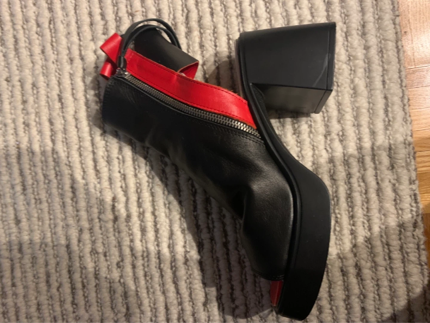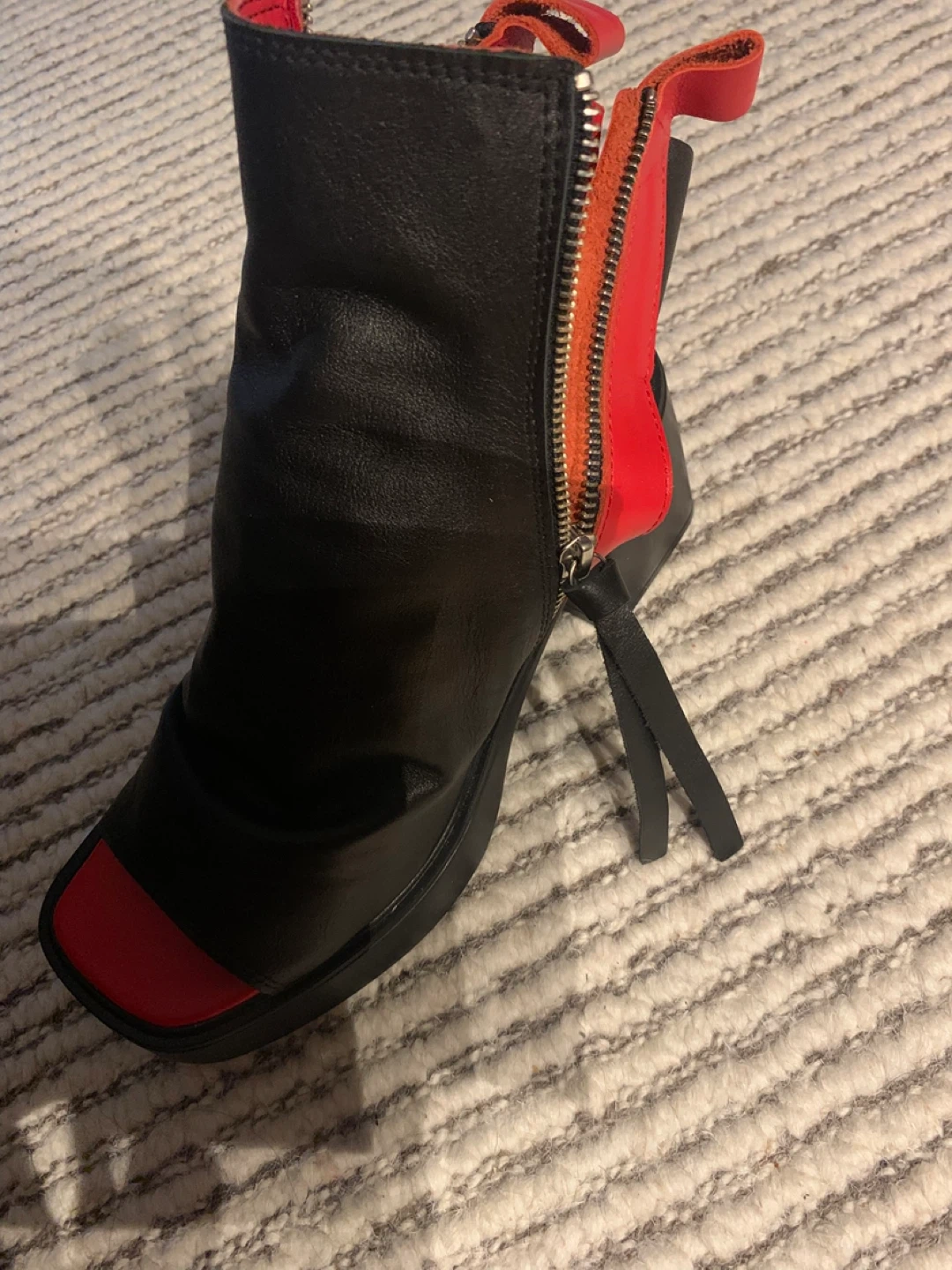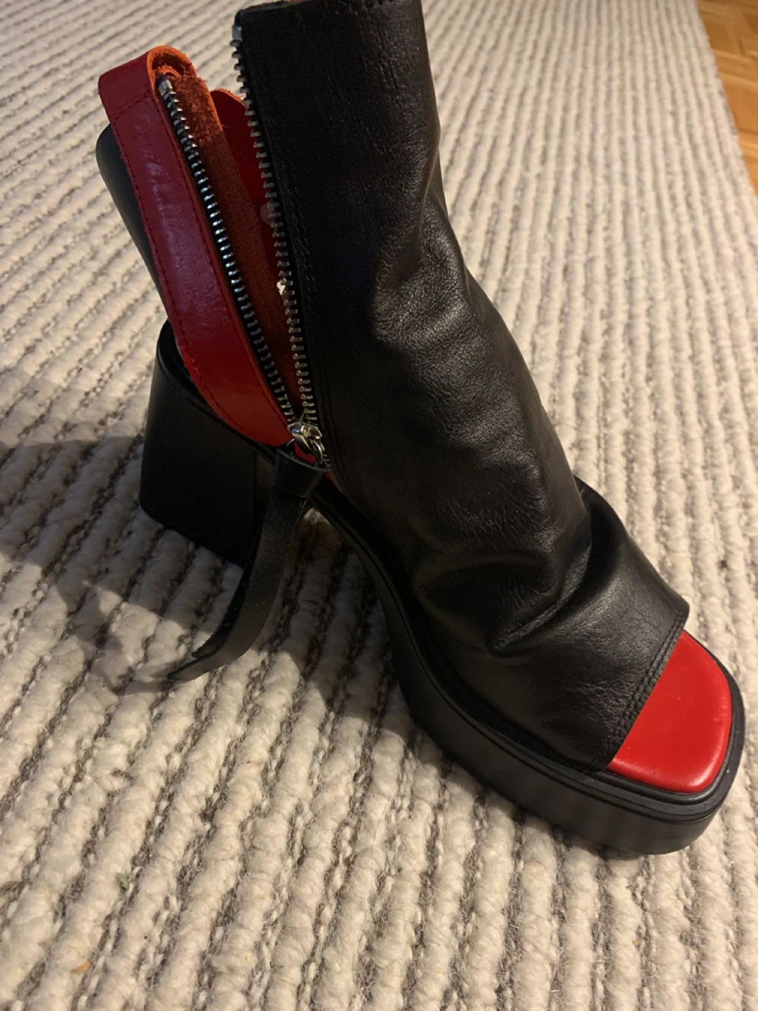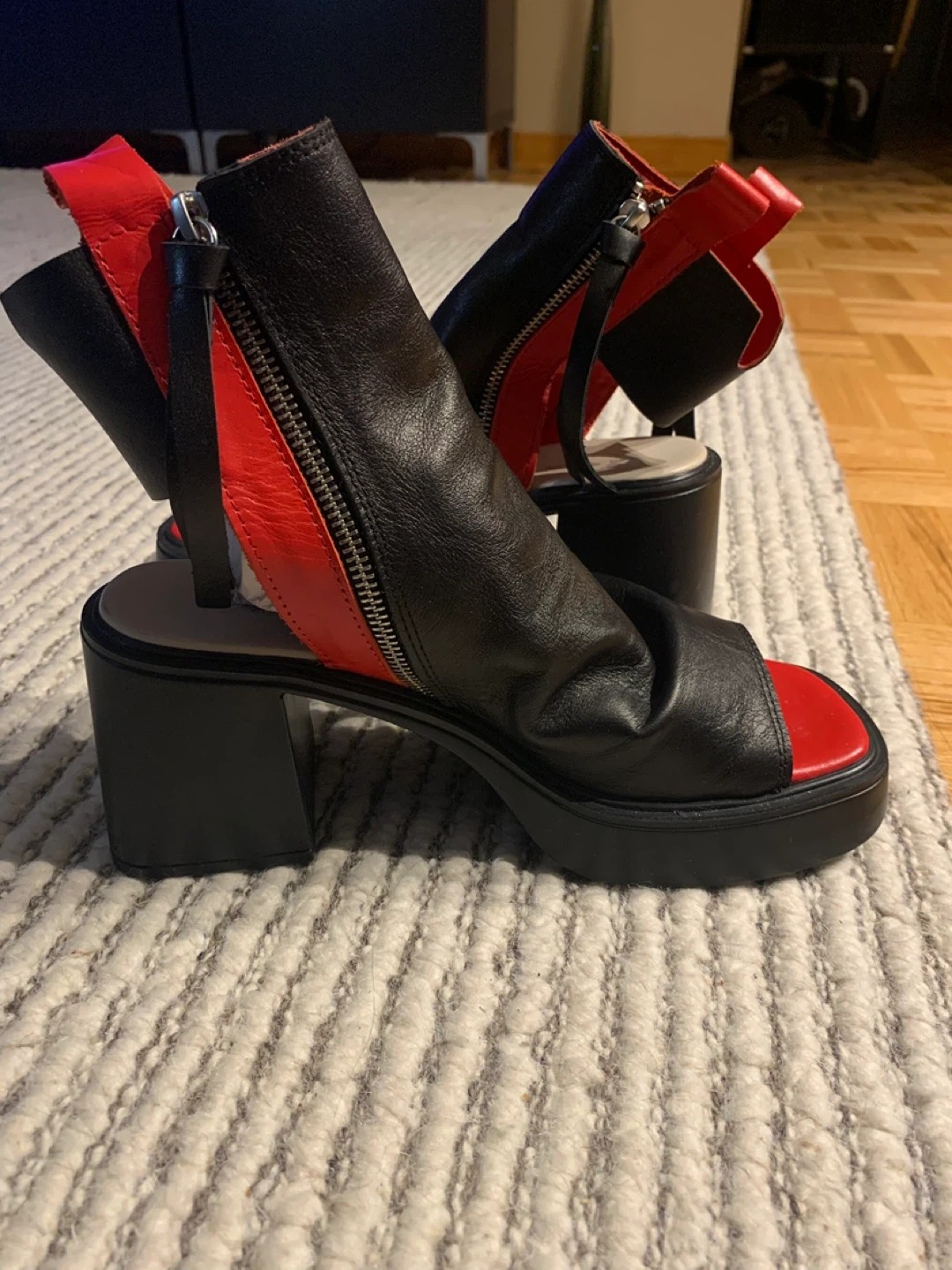 These are stylish black leather sandals with red accents. They feature a chunky block heel and a zipper closure for easy wear. The open-toe design is perfect for warmer weather.