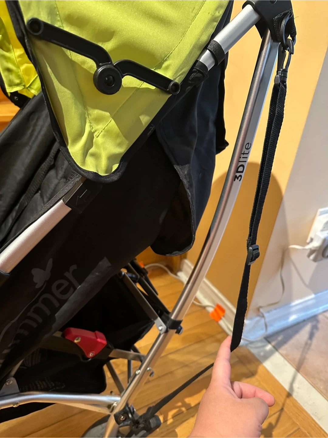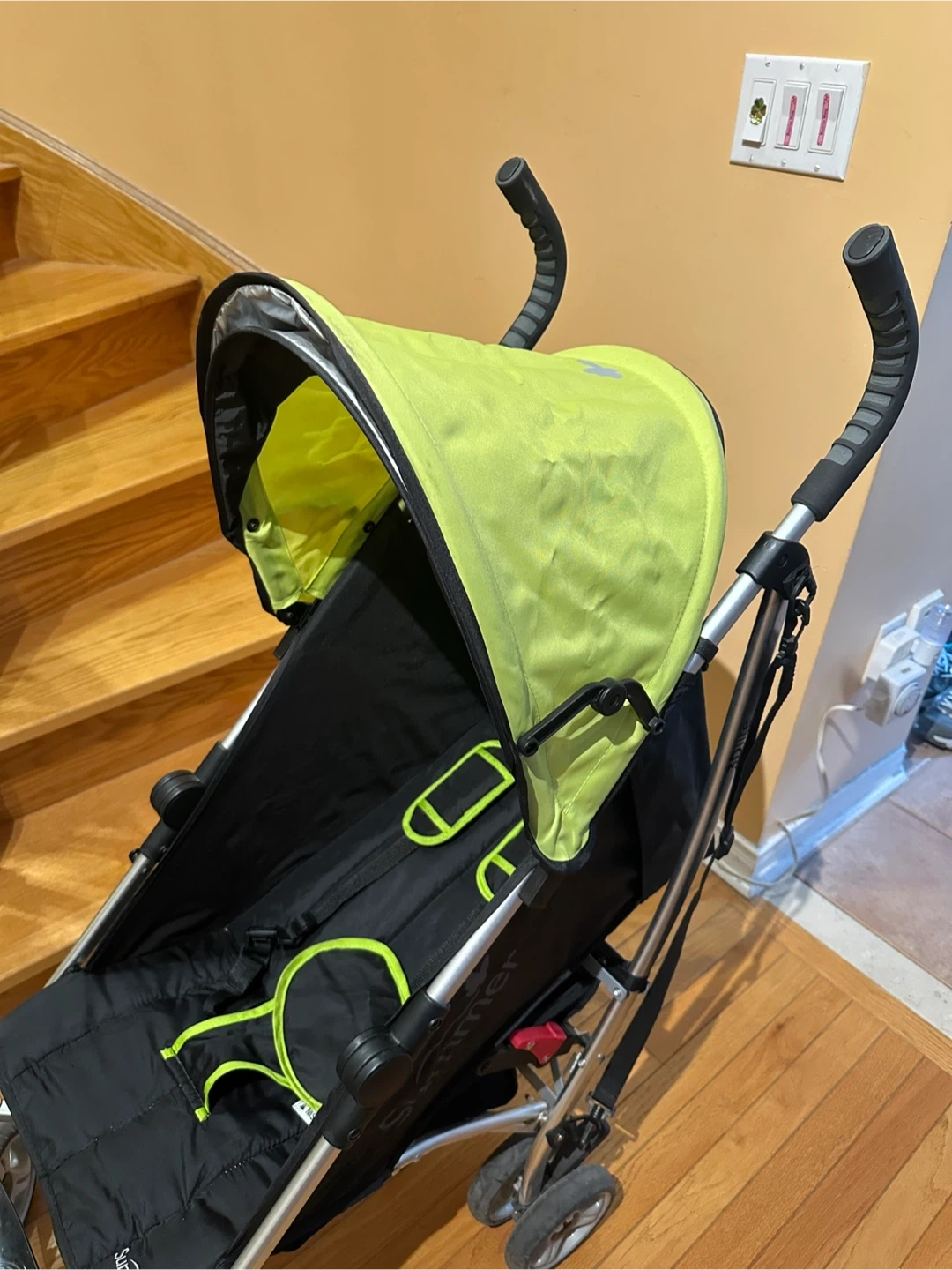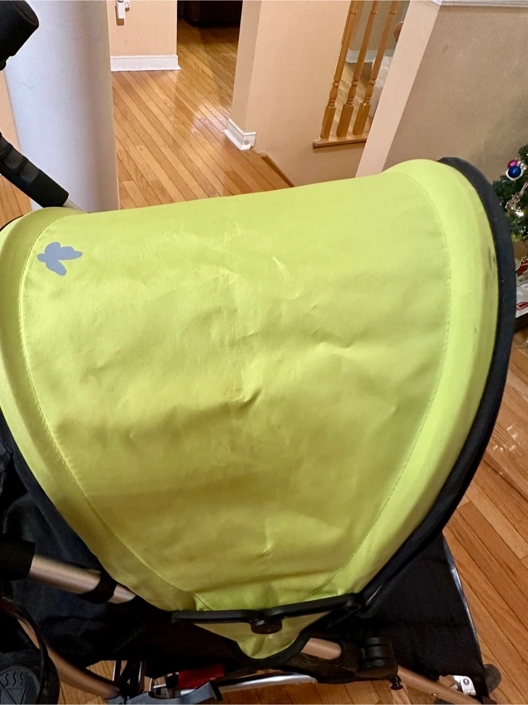 Somewhat discoloured canopy and slight wear and tear on the handles (see photos). But everything is in great working condition.