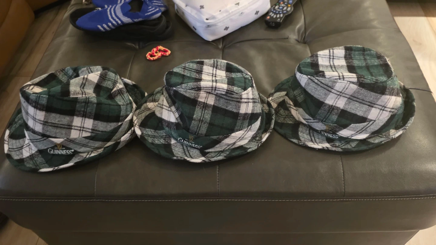 Here are some Guinness plaid fedora hats! They're in great condition and ready to wear. The plaid pattern features green, white, and black. Perfect for adding a bit of Irish flair to your outfit! 3 for 30