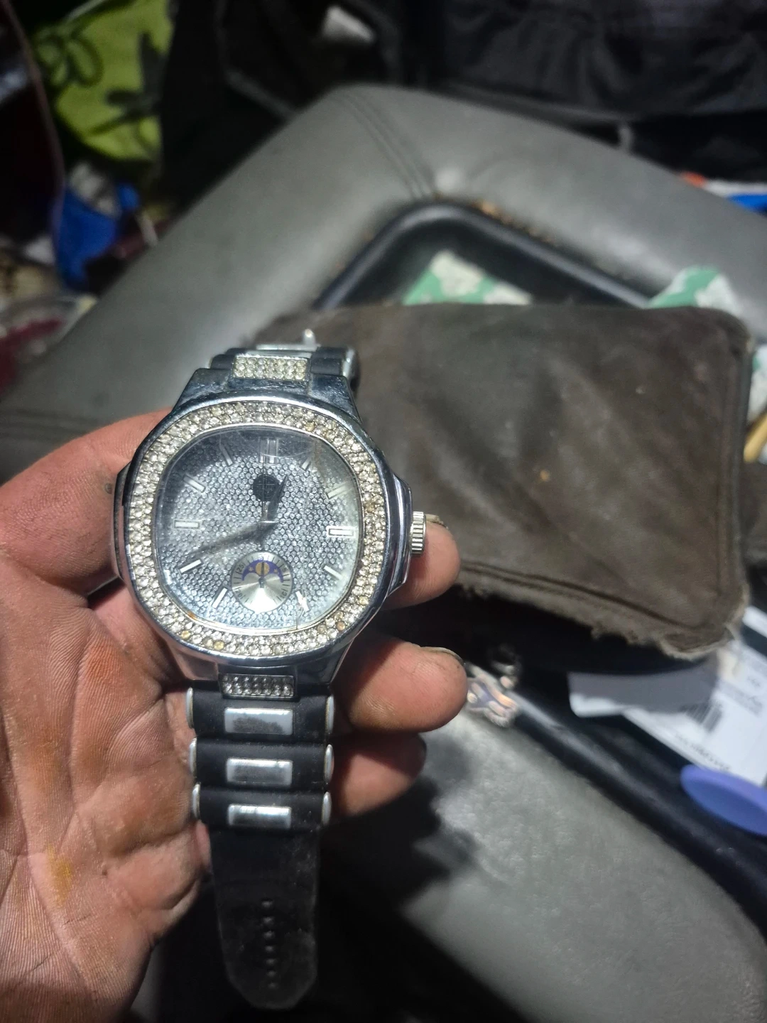 Selling a Techno Pave watch with a black rubber strap and stainless steel back. It's water-resistant and has a diamond dial. The model number is 8713.