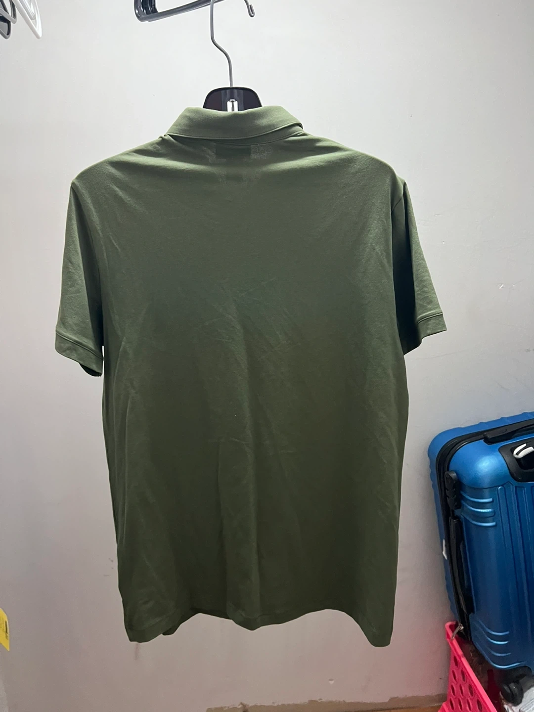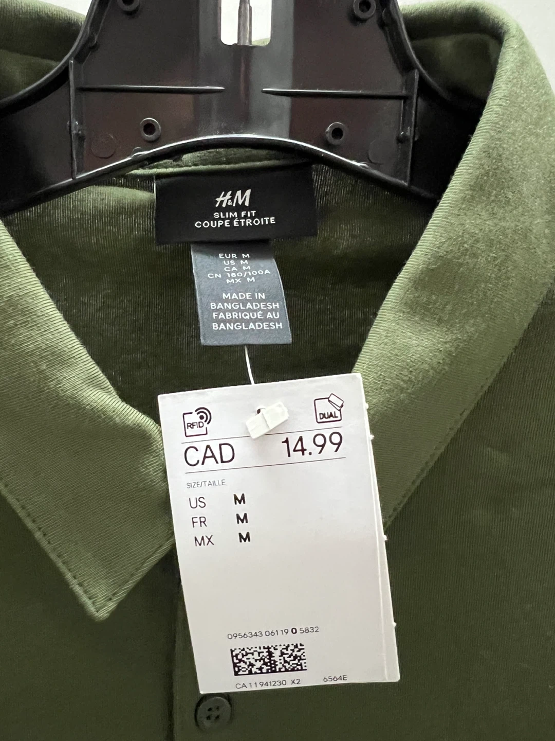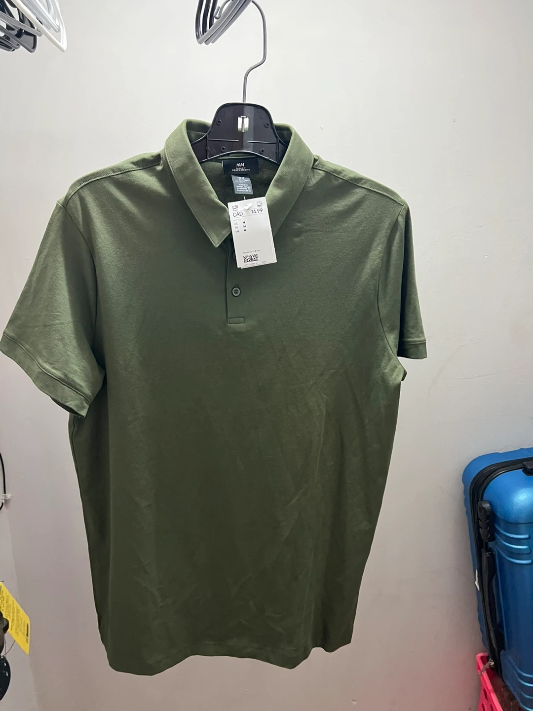 This is an H&M slim fit polo shirt in olive green. It's made from a soft material suitable for everyday wear. It's a size medium and still has the original tags attached.