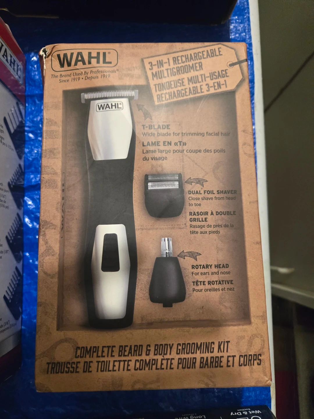Looking to sell a Wahl 3-in-1 rechargeable multigroomer! This complete beard and body grooming kit is perfect for all your grooming needs. It features a T-blade for trimming facial hair, a dual foil shaver for a close shave, and a rotary head for ears and nose
