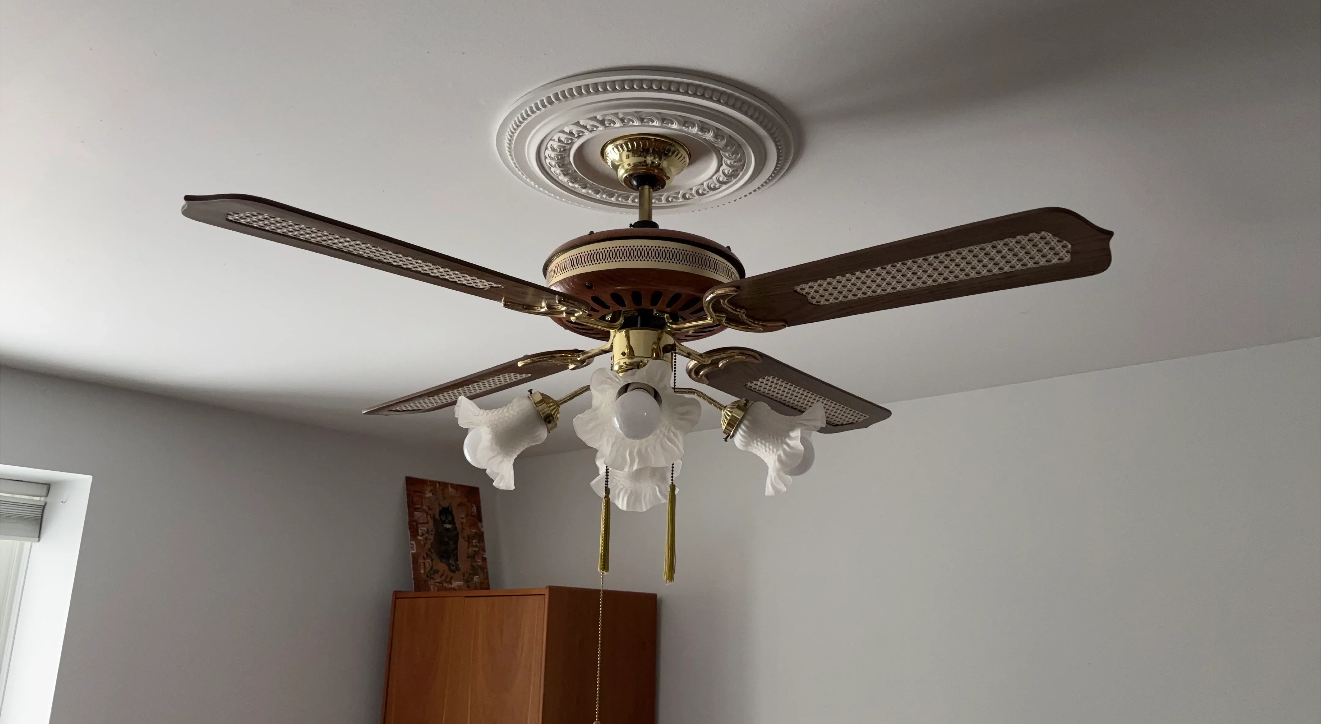 Classic ceiling fan with 4 wood blades and brass accents. Features four frosted glass light fixtures with decorative trim. Includes pull chains for fan speed, direction and light control. This fan is great for circulating air in a room!