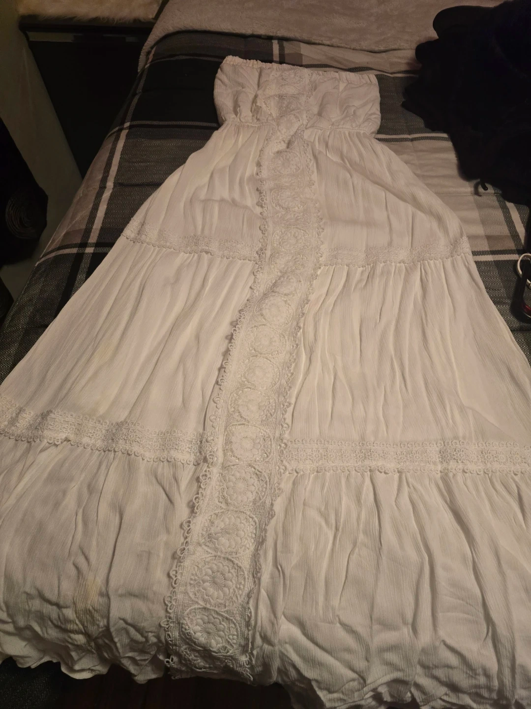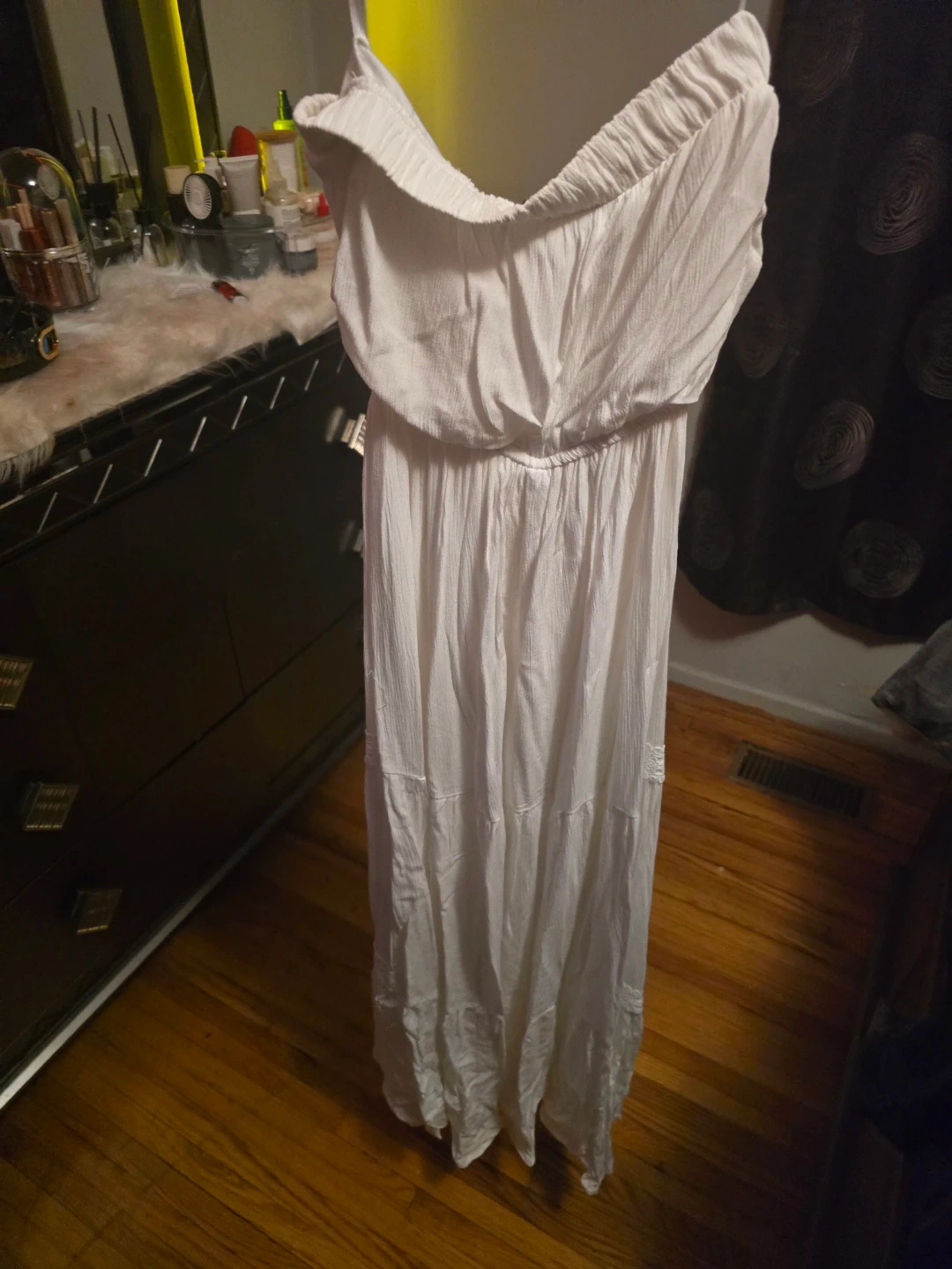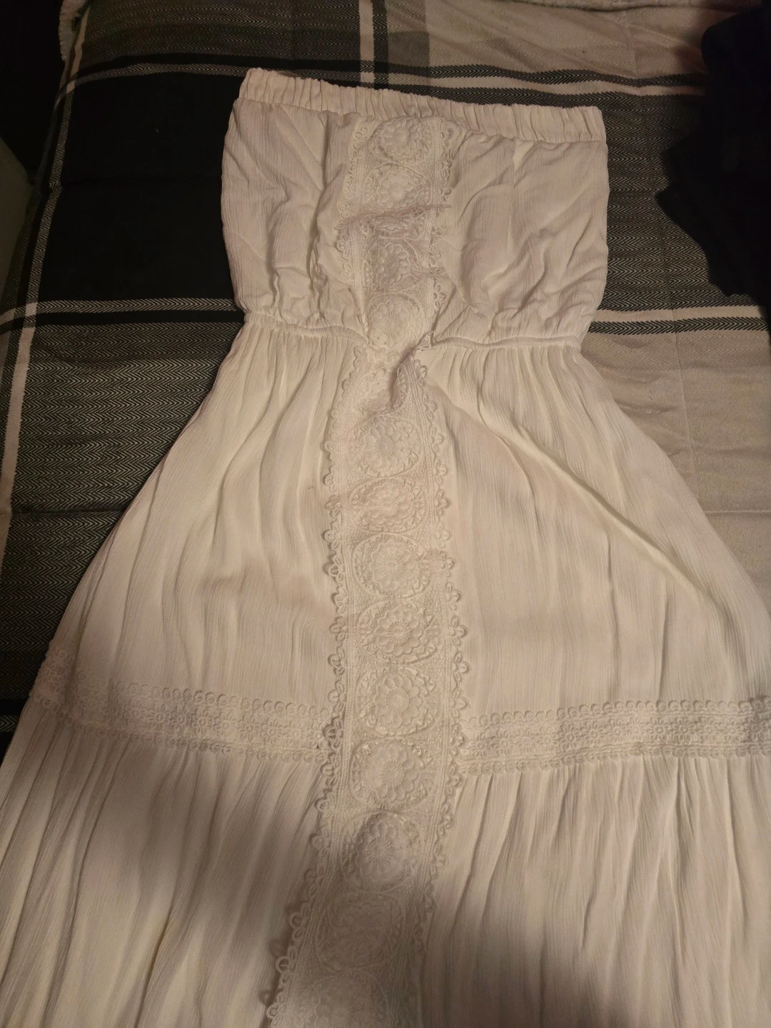 A white strapless maxi dress with a tiered skirt and lace trim. It has a stretchy smocked bodice for a comfortable fit. Great for warm weather outings!