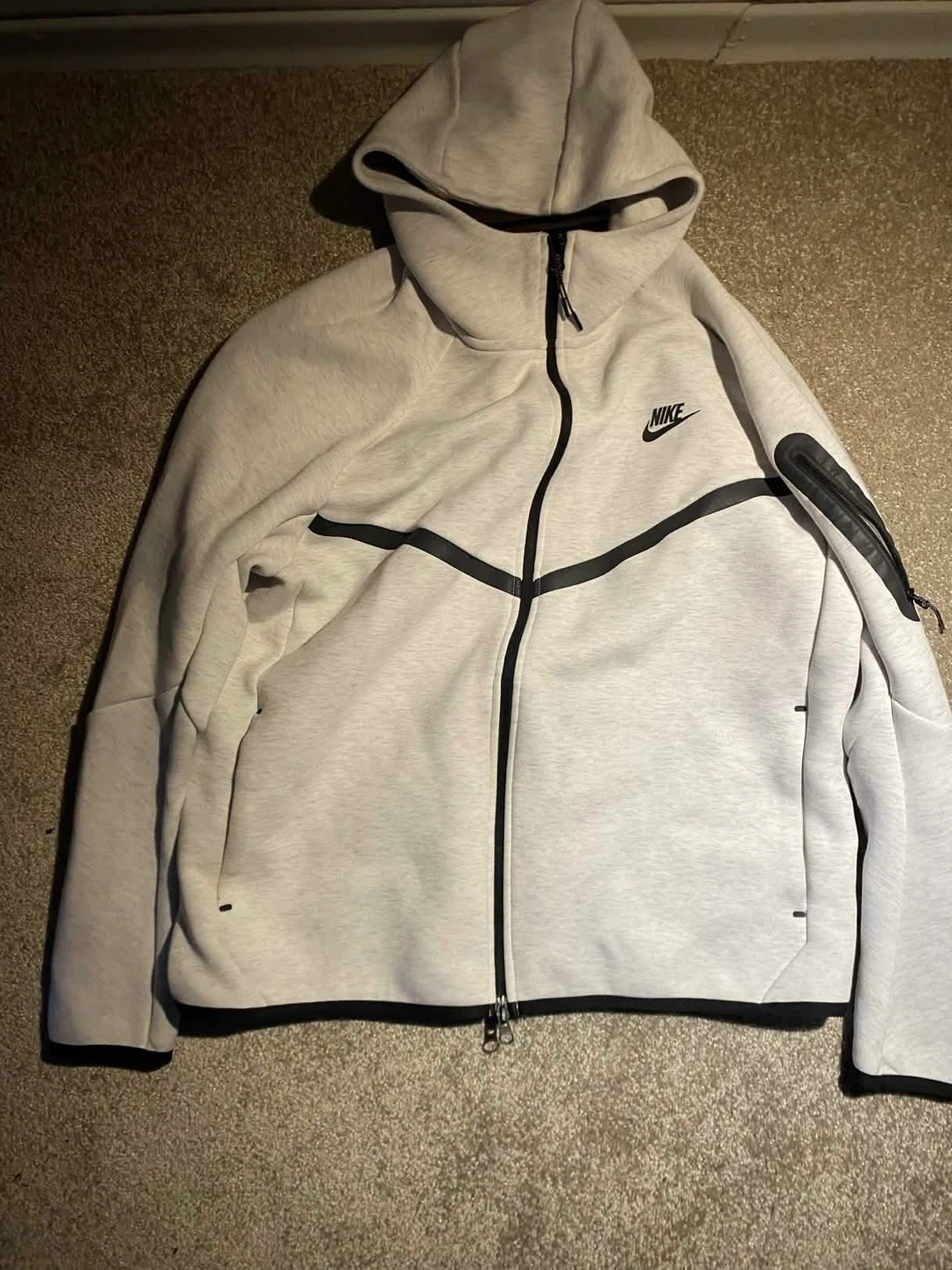 Nike Tech Fleece full-zip hoodie in a light grey colour. Features a hood and zip closure. Made in Cambodia. Size L.