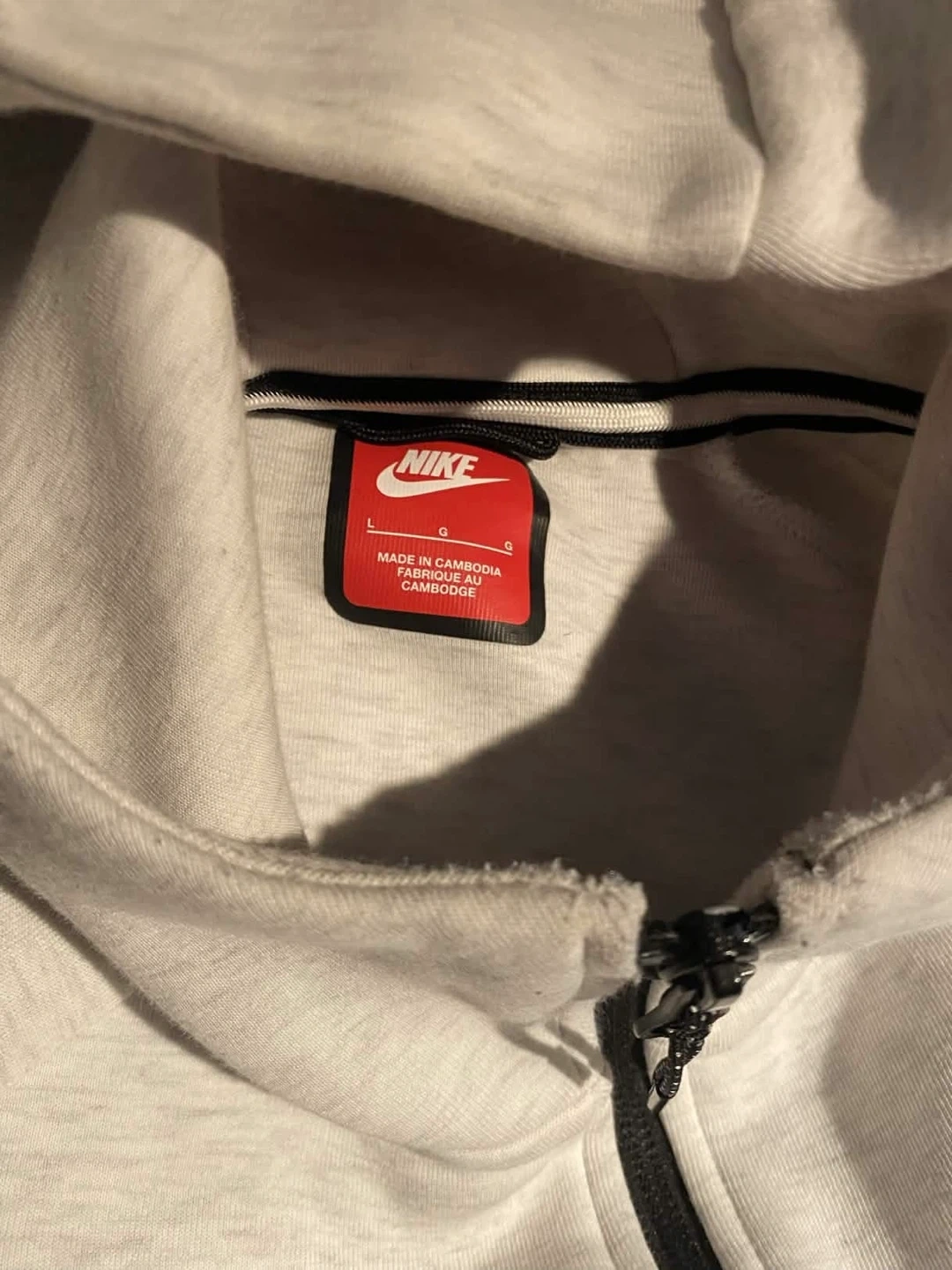 Nike Tech Fleece full-zip hoodie in a light grey colour. Features a hood and zip closure. Made in Cambodia. Size L.