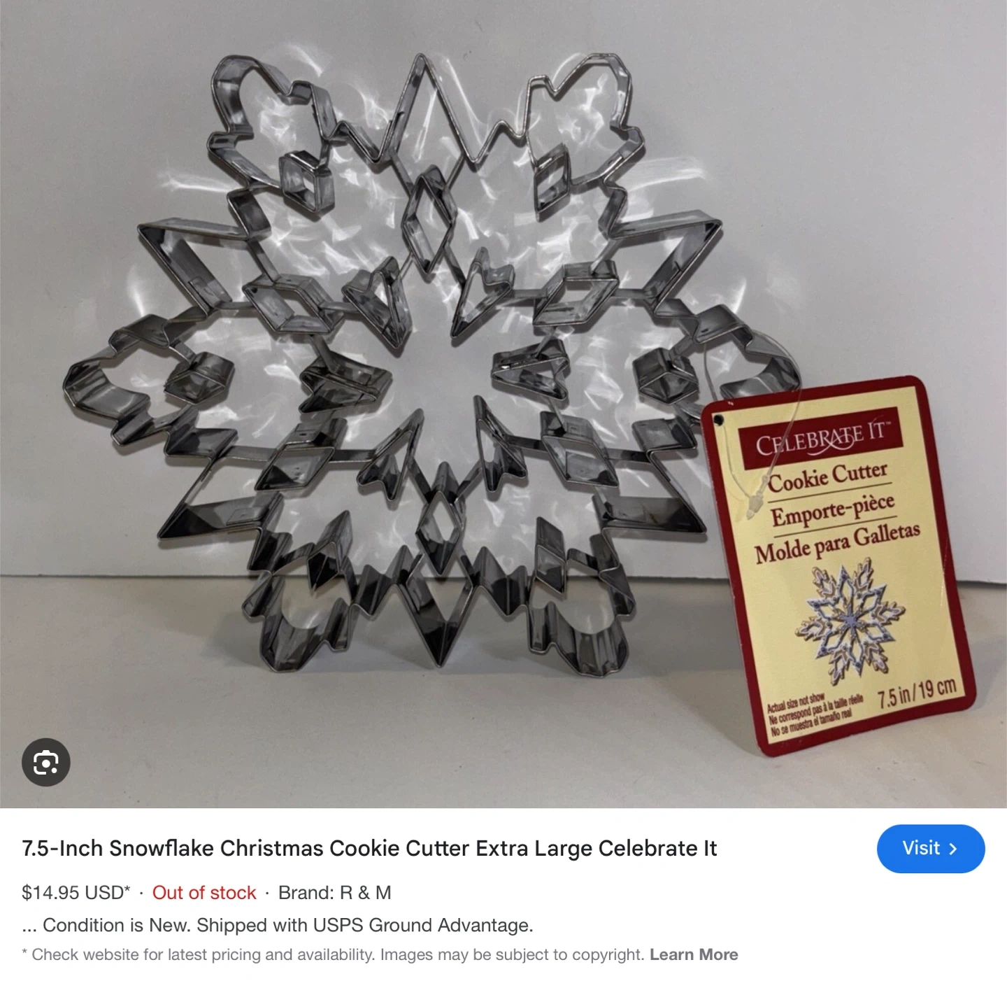132Selling a Celebrate It extra large snowflake cookie cutter! It's in new condition. It measures 7.5 inches / 19 cm