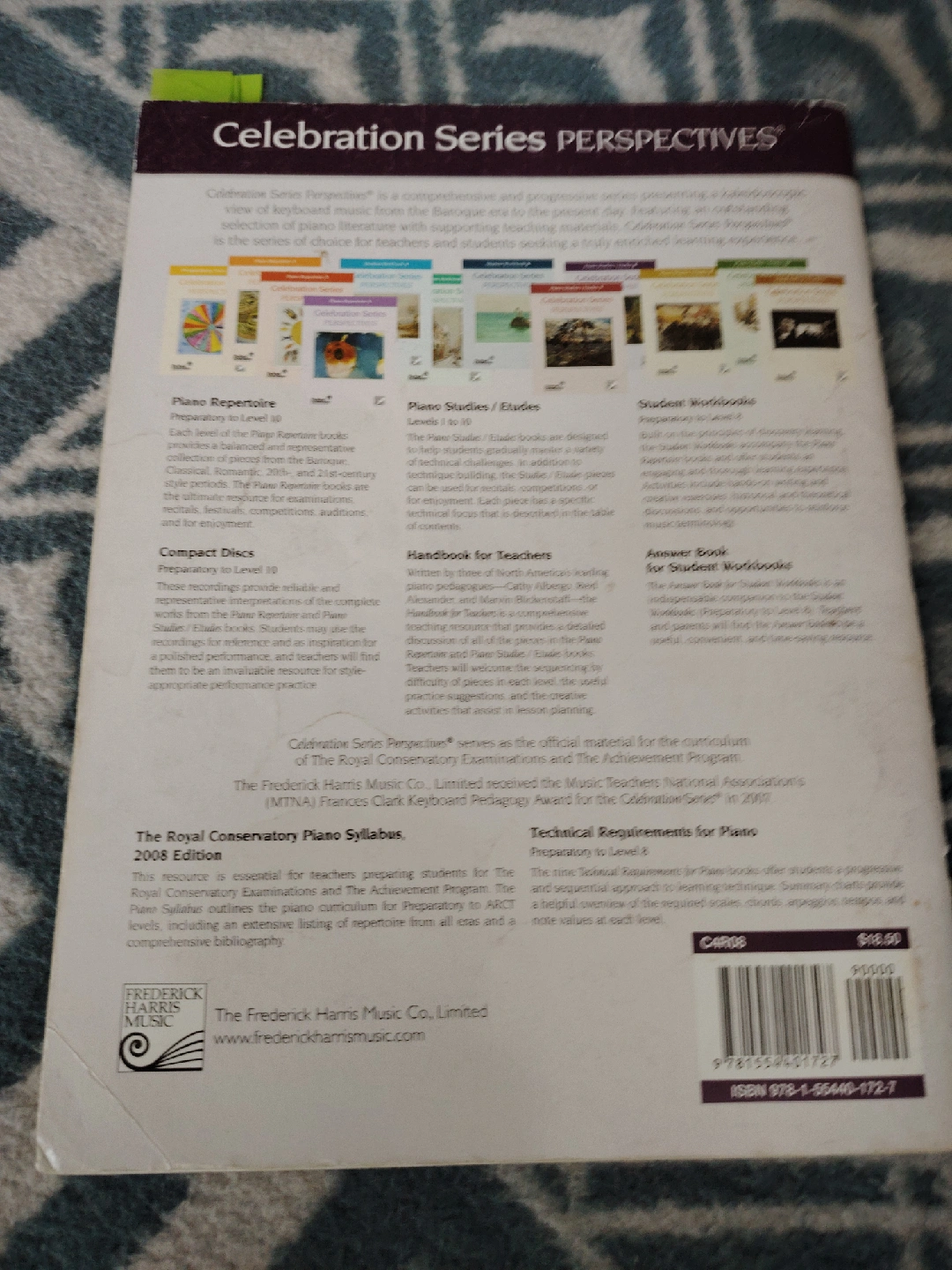 851🥕Selling a copy of Celebration Series Perspectives Piano Repertoire 8. This book is part of The Royal Conservatory series and is great for piano students. It includes a comprehensive and progressive series presenting a kaleidoscopic selection of piano literature with supporting teaching materials. Cash only no refund pick up at Erin mill town center mississauga.
