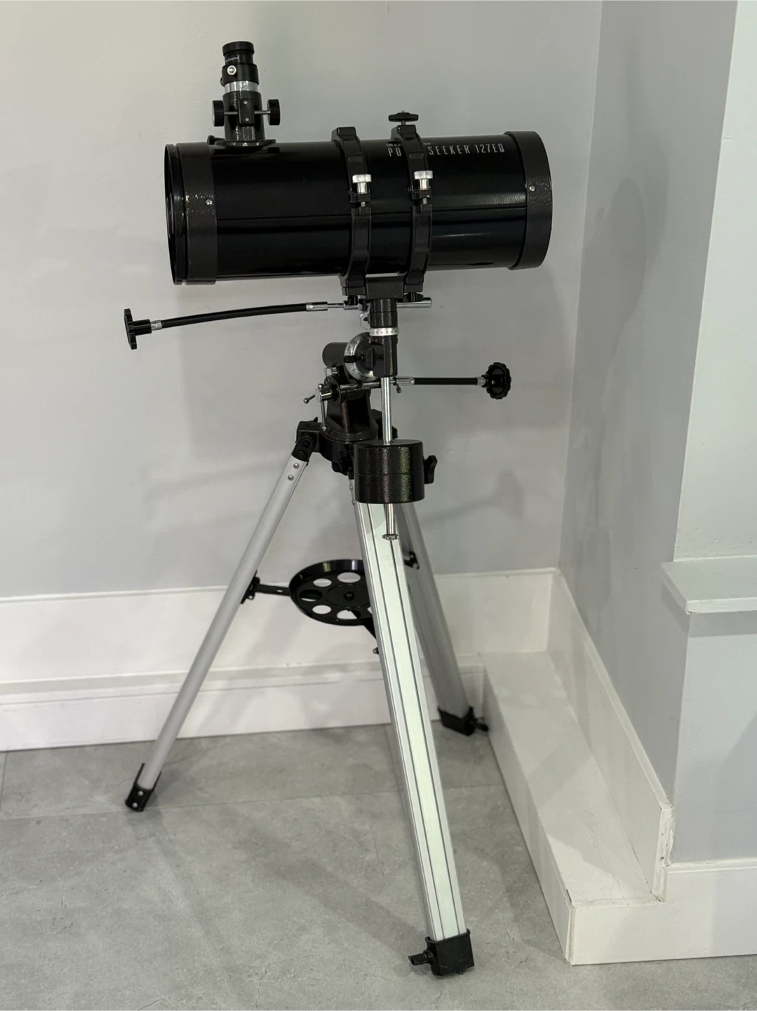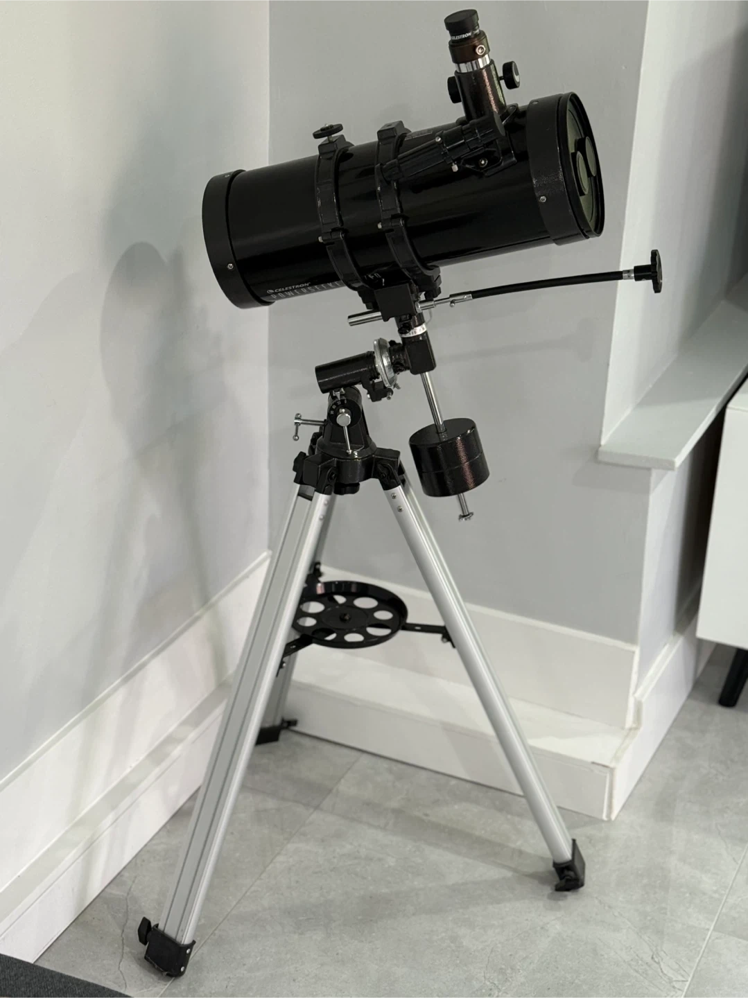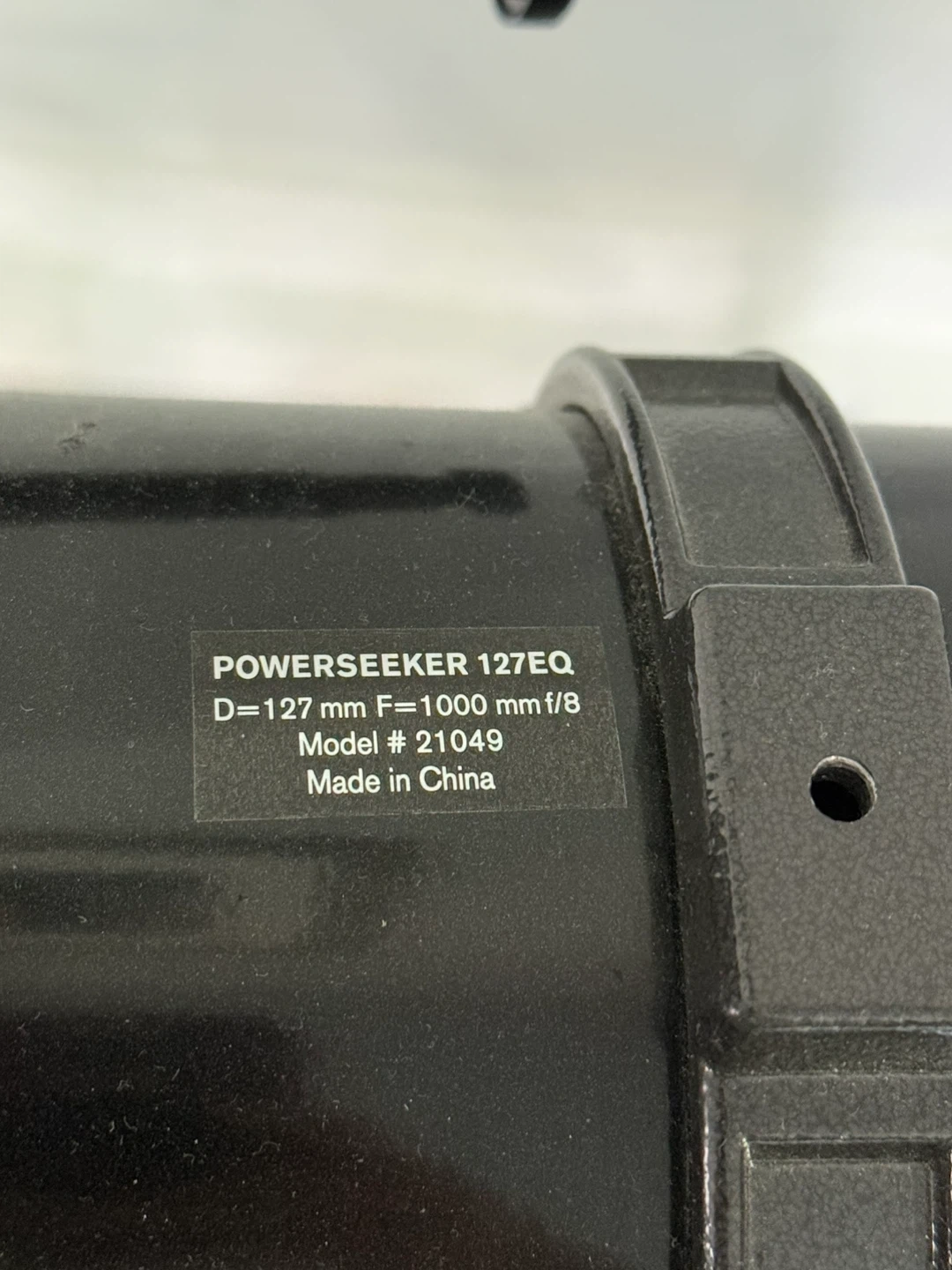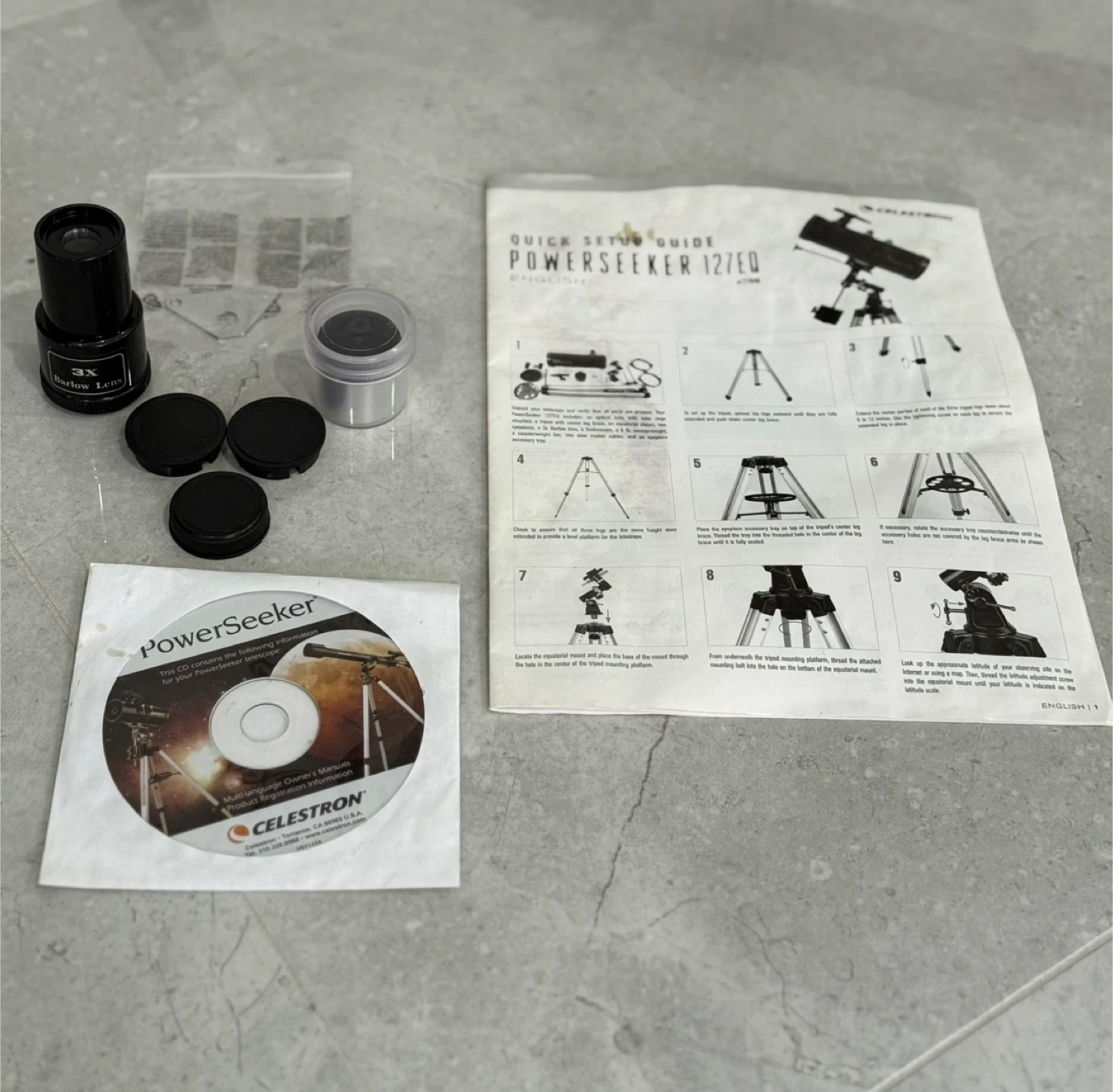 71Selling a Celestron PowerSeeker 127EQ telescope! It's in great shape and ready for some stargazing. The telescope features: - D=127 mm - F=1000 mm f/8 - Model # 21049 HIGHLIGHTS Manual German equatorial mount with setting circles to accurately locate and track sky objects Adjustable, full height tripod with deluxe accessory tray Quick and easy no-tool setup Accessories include a 20mm and 4mm eyepiece, a finderscope, and a Barlow Lens 3x Barlow lens triples the magnifying power of each eyepiece Download Starry Night Basic Software with a 36,000 object database, printable sky maps and enhanced images including 3D renderings of stars, exoplanets, and galaxies Discover our Solar System with the Celestron PowerSeeker 127EQ! You'll be ready to observe in minutes thanks to the quick and easy no-tool setup. The 127EQ provides bright, clear images of the Moon, planets, star clusters, and more for great nighttime viewing. Manual German Equatorial telescope The PowerSeeker mount comes with two slow motion control knobs that allow you to make fine pointing adjustments to the telescope in both Right Ascension and Declination axes, also referred to as RA and DEC. Accessories Included Accessories include a 20mm and 10mm eyepiece, a finderscope, and a 3x Barlow lens. The two eyepieces offer different magnifications for low and high powered views. The 3x Barlow lens triples the magnifying power of each eyepiece. Starry Night Software Download Celestron's Starry Night Software and learn about the night sky, celestial objects, and how to plan your next observing session. Celestron Starry Night Software is the premier astronomy software package on the market, providing resources and knowledge to view our solar system and beyond.