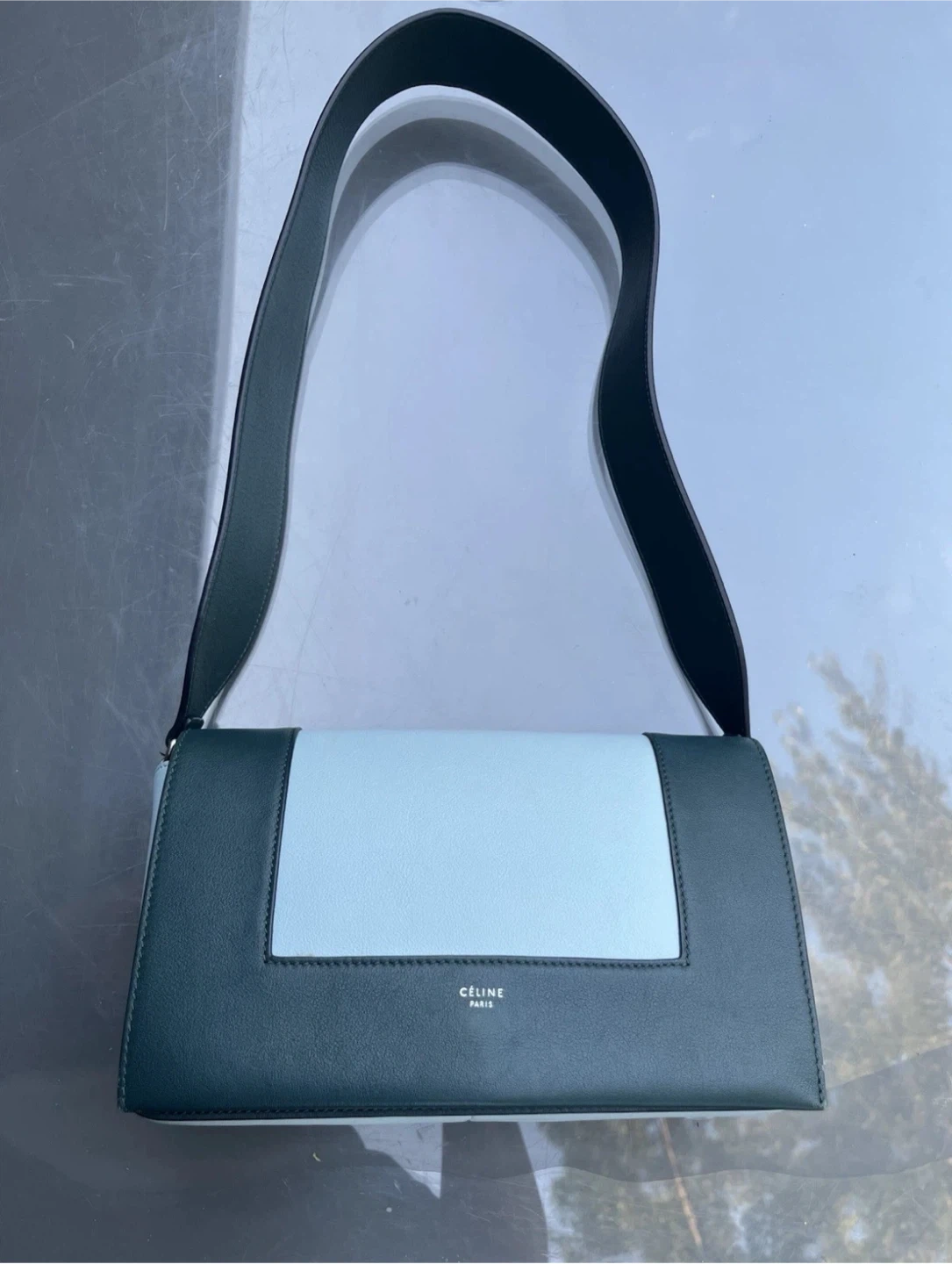 A beautiful Celine handbag in a dark green and light blue leather. The bag has a structured shape and a secure closure. Inside, there's a zippered compartment for keeping your valuables safe and organized. It's in great condition and ready for a new home