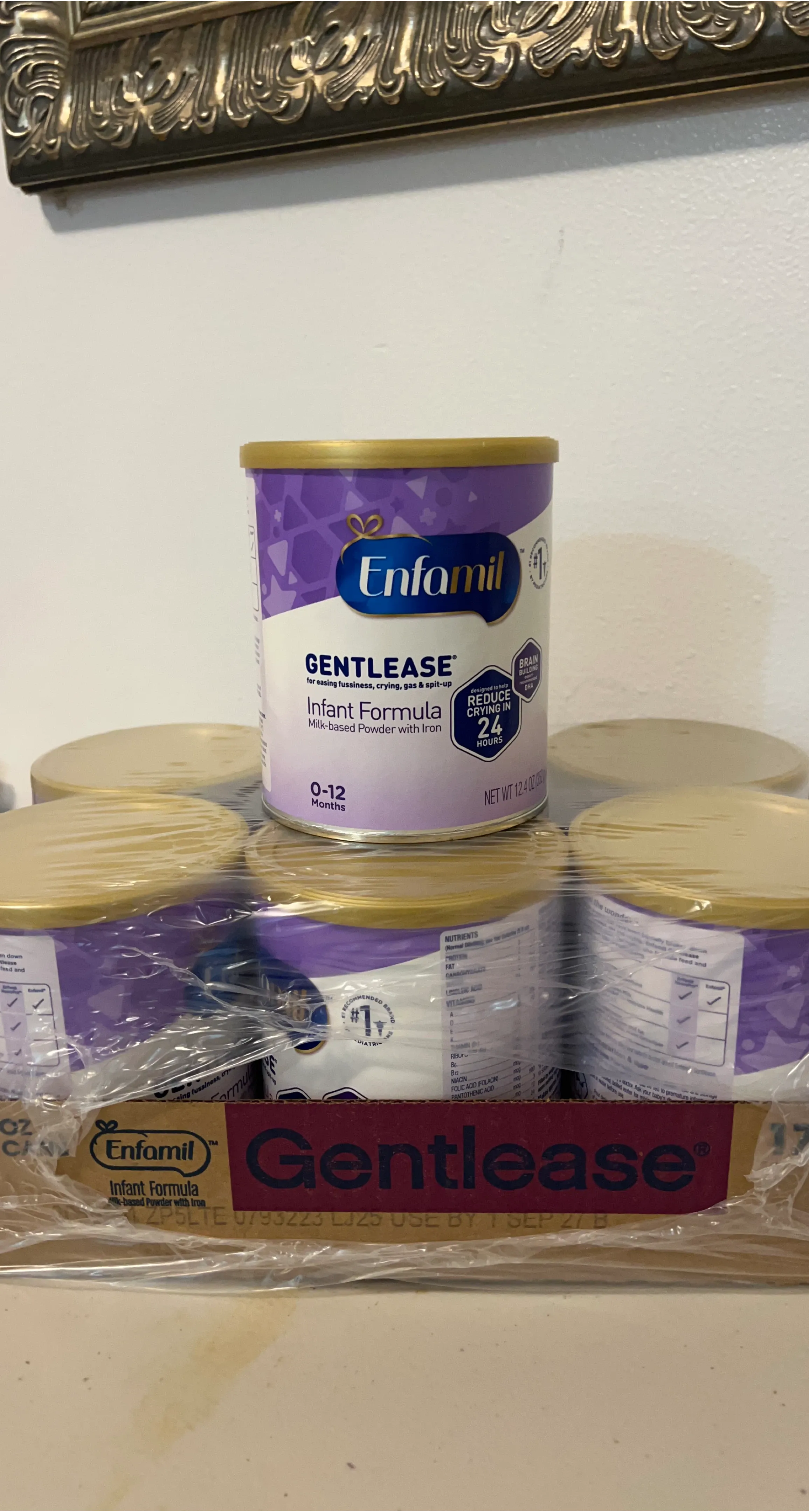 This is Enfamil Gentlease infant formula. It's a milk-based powder with iron designed for babies aged 0-12 months. It's formulated to help reduce crying, fussiness, gas, and spit-up.