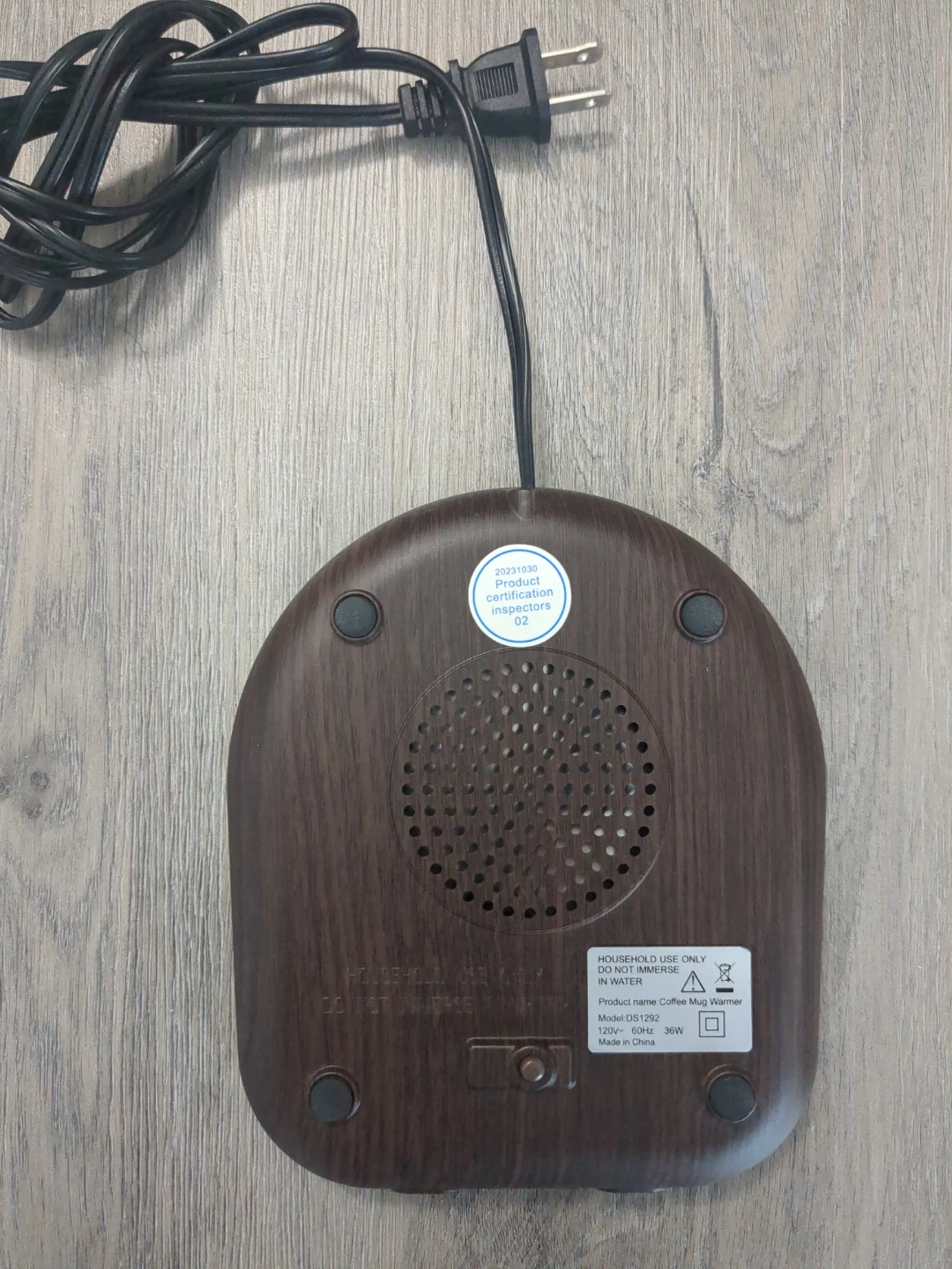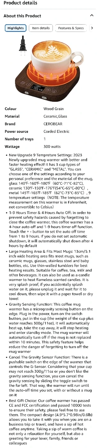 This is a coffee mug warmer. It features adjustable temperature settings and a digital display. The unit is made with a wood-grain finish and has a power rating of 36W.