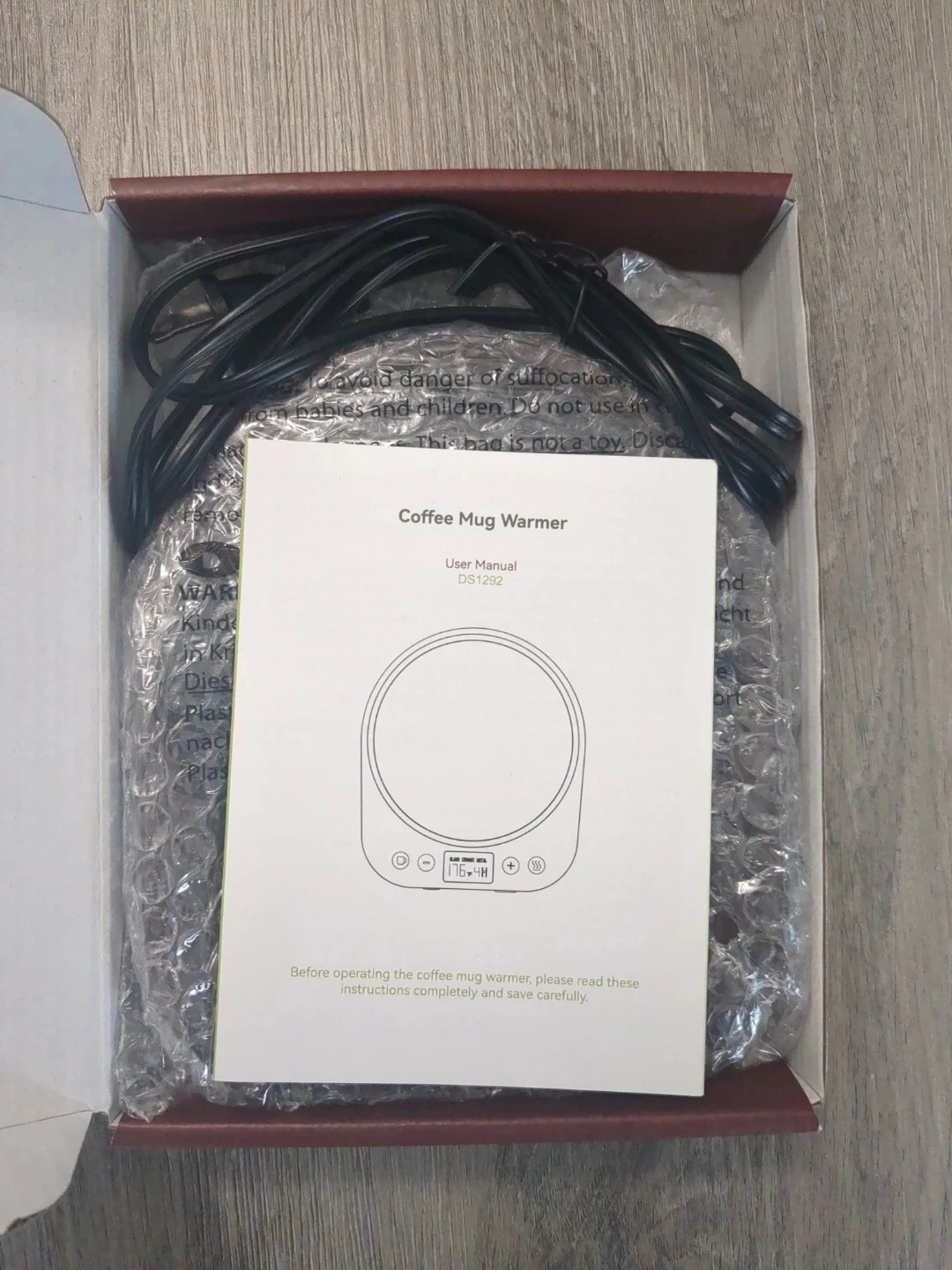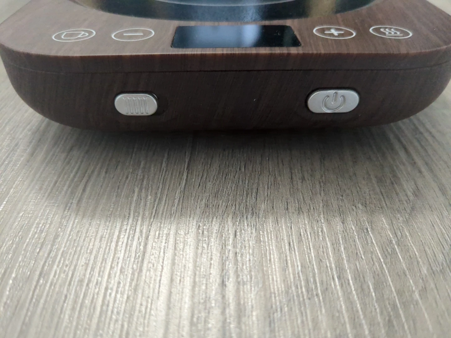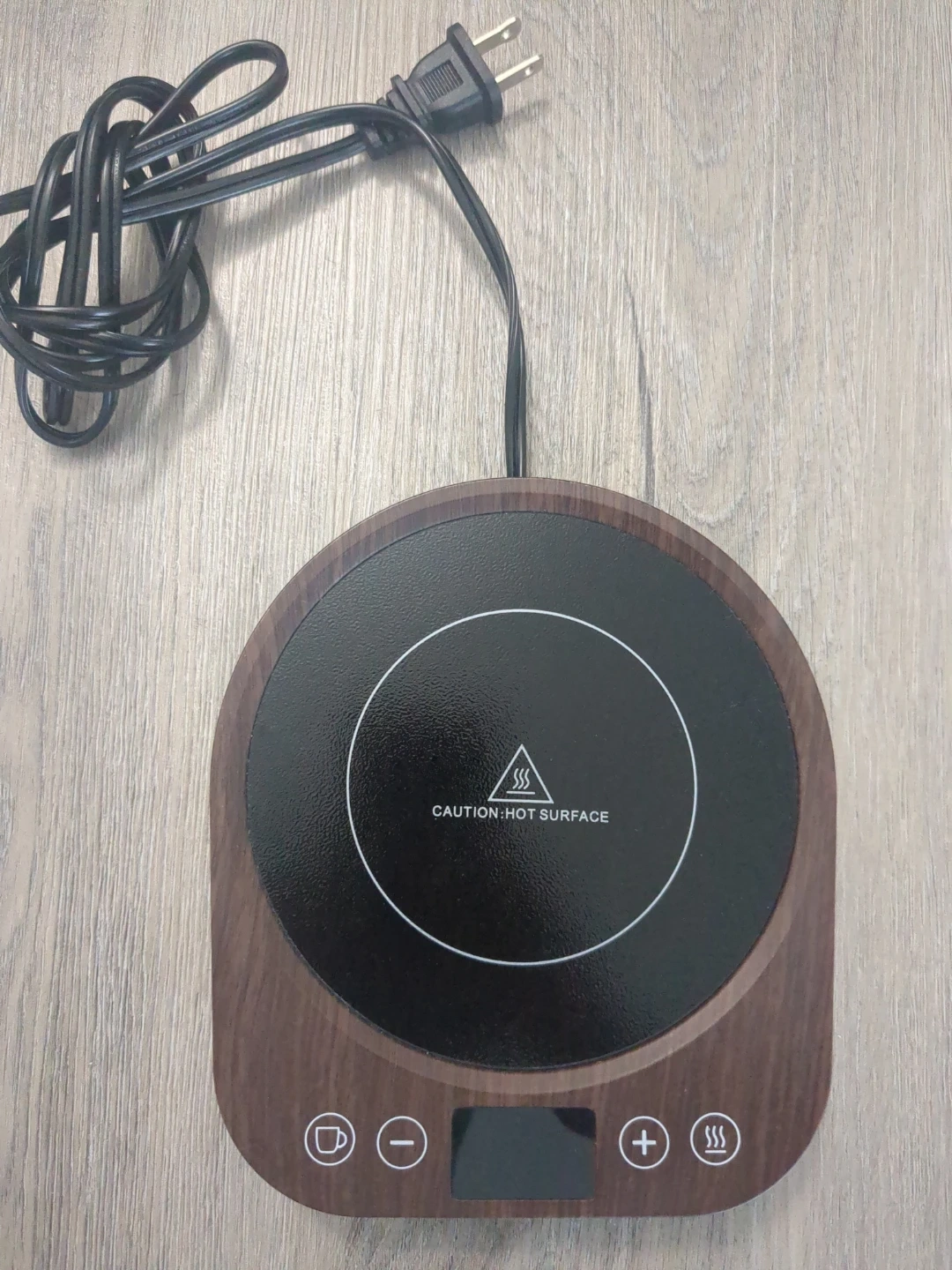This is a coffee mug warmer. It features adjustable temperature settings and a digital display. The unit is made with a wood-grain finish and has a power rating of 36W.