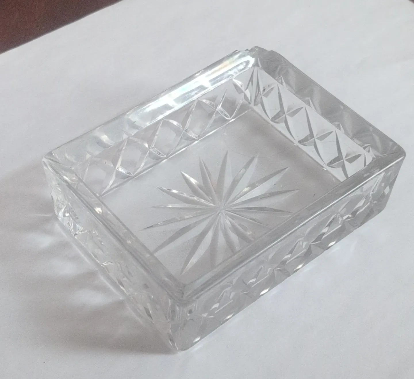 Clear glass trinket dish with a starburst and diamond cut pattern. It's a lovely piece for small items. Glass material.