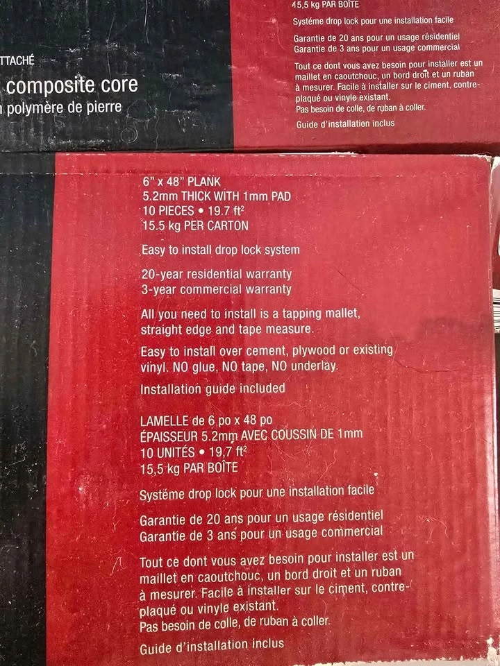 Brand new vinyl plank flooring, 15 boxes total, with 19.7 sq ft per box. Heavy, but can fit in a car. Located in Manotick. Willing to sell as a lot or consider splitting for the right offer. Cost of them was approximately $1250, purchased at Rona less than a year ago. Reasonable offers considered.
