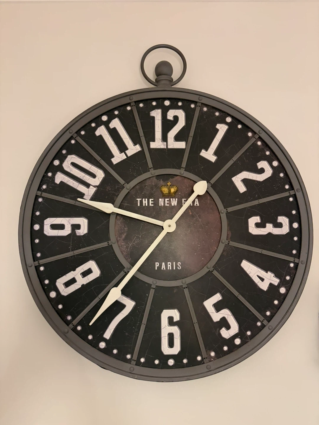 Stylish wall clock with large white numbers on a black distressed face. The clock displays 'The New Era Paris' in the centre. It's a decorative piece that's sure to add some character to any room!