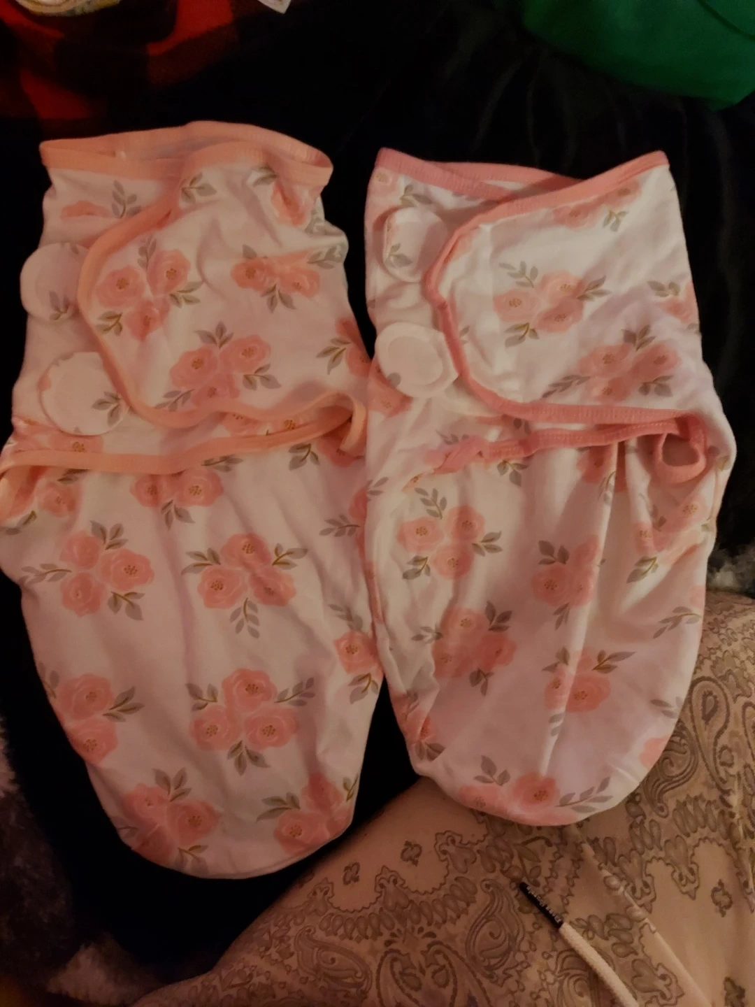 Two baby swaddle sleep sacks with a pink floral print. These wraps have velcro closures for easy use. Made from soft fabric for baby's comfort.