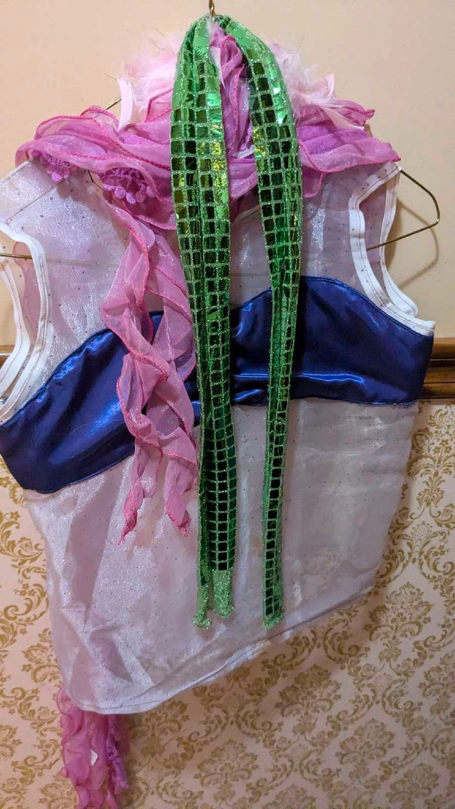 This adorable, hand-sewn child's mermaid/Ariel costume features a shimmering top with a purple accent and a long, glittering green tail. It's in good used condition. I made it with love for my child, who has now outgrown it. It's perfect for dress-up, Halloween, or any costume party! Pink kelp toss around scarf or a green glittery one. Or you can turn them into headbands. Tail - 87cm / 34 in