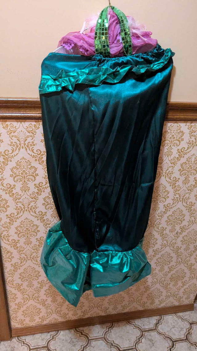 This adorable, hand-sewn child's mermaid/Ariel costume features a shimmering top with a purple accent and a long, glittering green tail. It's in good used condition. I made it with love for my child, who has now outgrown it. It's perfect for dress-up, Halloween, or any costume party! Pink kelp toss around scarf or a green glittery one. Or you can turn them into headbands. Tail - 87cm / 34 in