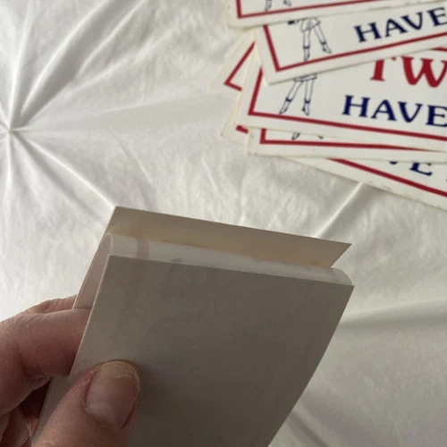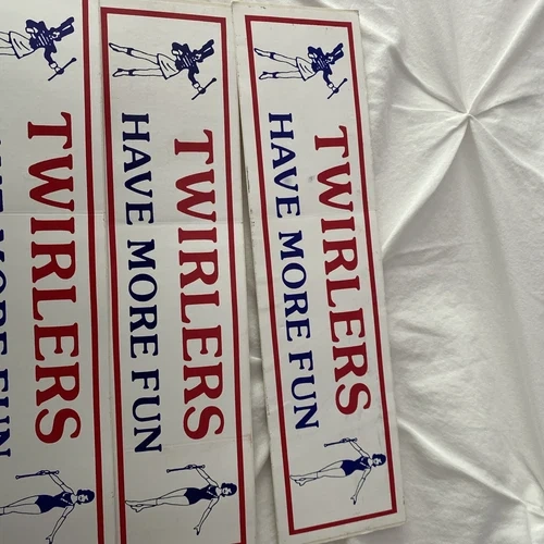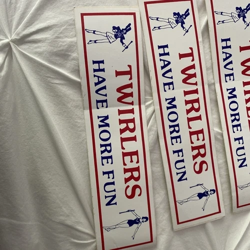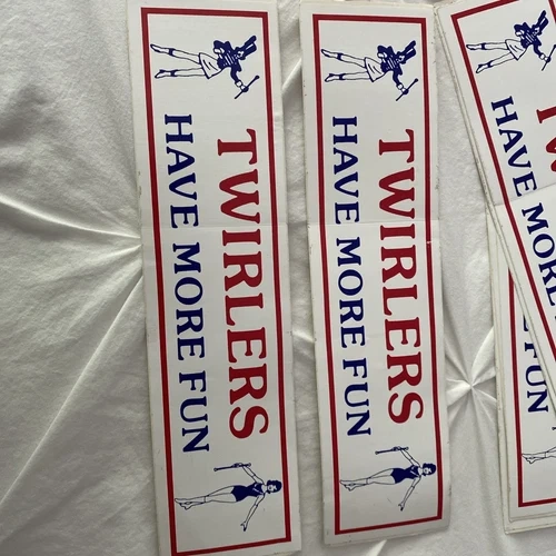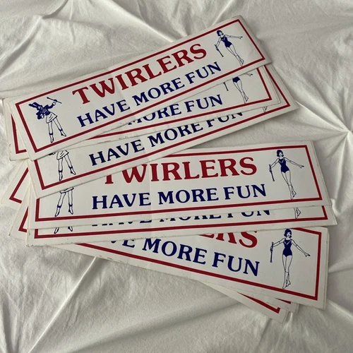 Add a touch of nostalgia to your collection with these Vintage Baton Twirling Bumper Stickers from the 1990s. Each sticker measures 11.5” by 3” and features a classic white design that captures the spirit of the era. Perfect for baton twirling enthusiasts or collectors of unique decals and stickers, these bumper stickers boast a timeless charm. Whether you're a fan of vintage collectibles or looking to enhance your vehicle's personality, these baton twirling bumper stickers tell a story of individuality and style. They're not just stickers; they're a piece of history from the mid-90s, ready to be displayed with pride on your favorite ride. Stickers are new in that they have never been peeled and stuck to any surface. Given their age, there is wear on the surface and around the edges. See photos to review condition. There are 8 stickers in total.