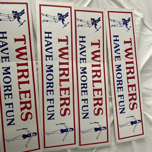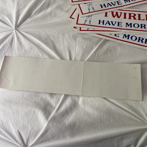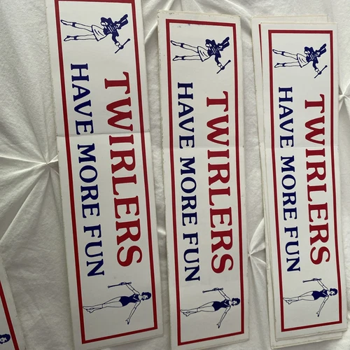 Add a touch of nostalgia to your collection with these Vintage Baton Twirling Bumper Stickers from the 1990s. Each sticker measures 11.5” by 3” and features a classic white design that captures the spirit of the era. Perfect for baton twirling enthusiasts or collectors of unique decals and stickers, these bumper stickers boast a timeless charm. Whether you're a fan of vintage collectibles or looking to enhance your vehicle's personality, these baton twirling bumper stickers tell a story of individuality and style. They're not just stickers; they're a piece of history from the mid-90s, ready to be displayed with pride on your favorite ride. Stickers are new in that they have never been peeled and stuck to any surface. Given their age, there is wear on the surface and around the edges. See photos to review condition. There are 8 stickers in total.