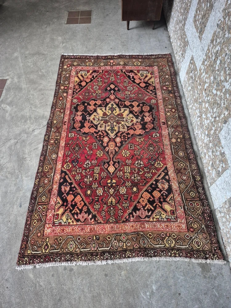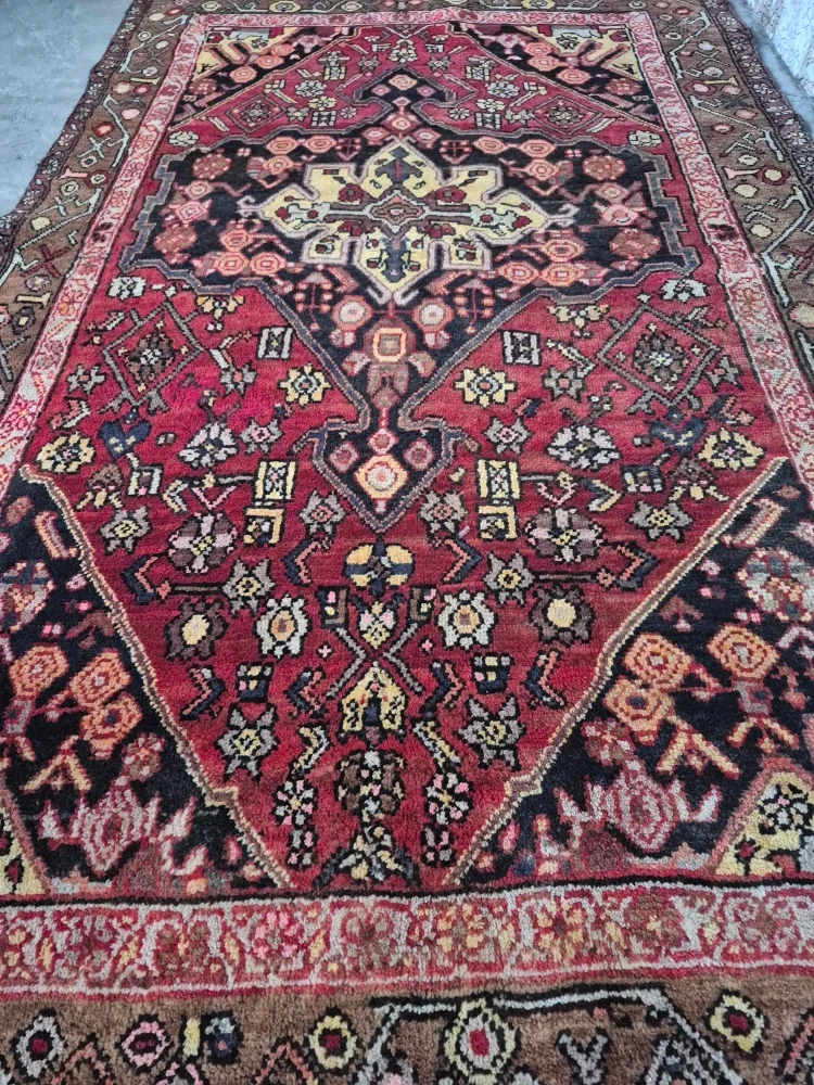 Beautiful vintage rug featuring a bold central medallion with intricate detailing and warm tones of deep red, brown, black, and gold. This piece has an authentic hand-knotted look with a detailed border and classic geometric + floral motifs.
