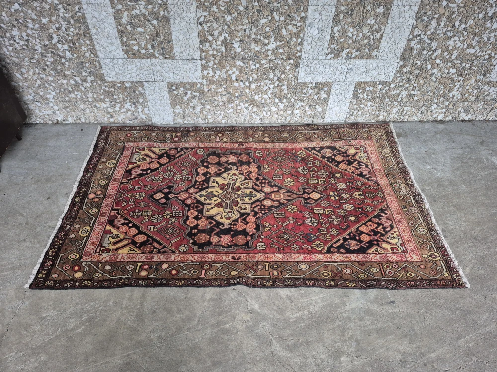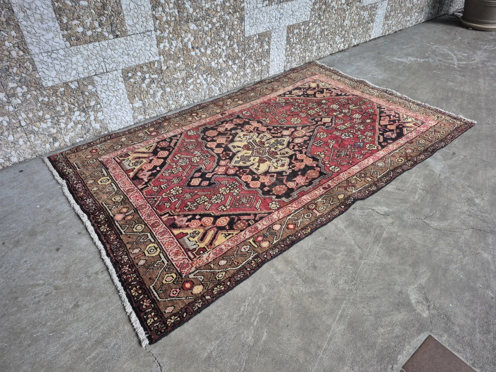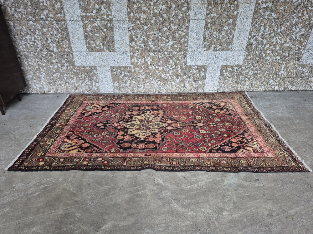 Beautiful vintage rug featuring a bold central medallion with intricate detailing and warm tones of deep red, brown, black, and gold. This piece has an authentic hand-knotted look with a detailed border and classic geometric + floral motifs.