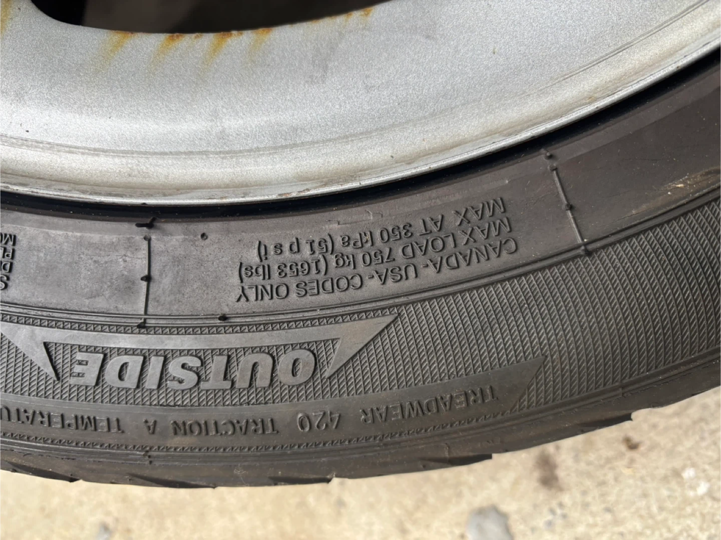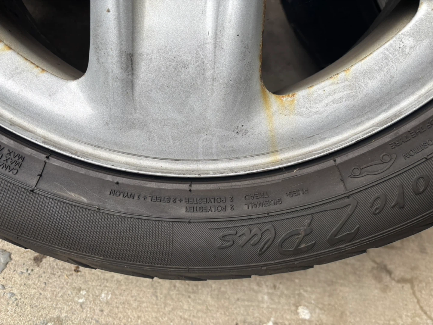 Set of four 215/55R17 tires mounted on rims. Tires are 98H rated. Rim size is 17 inches. Sidewall construction includes 2 Polyester + 2 Steel + 1 Nylon.