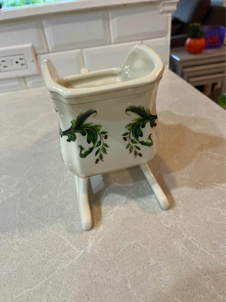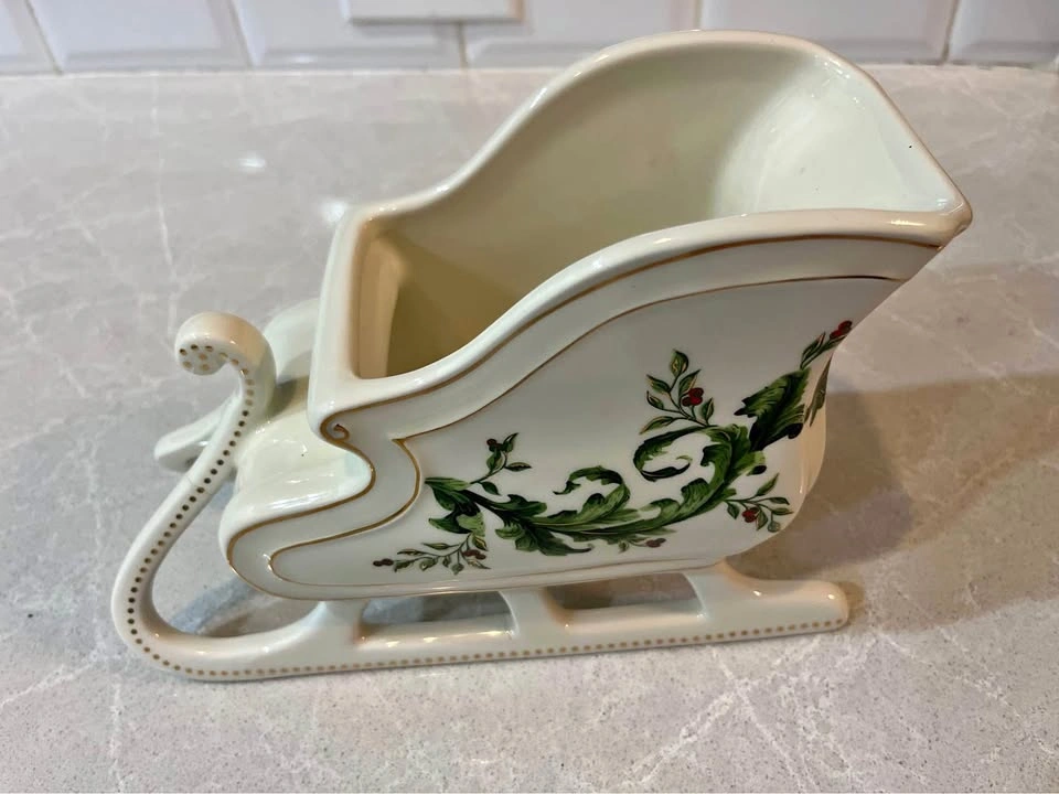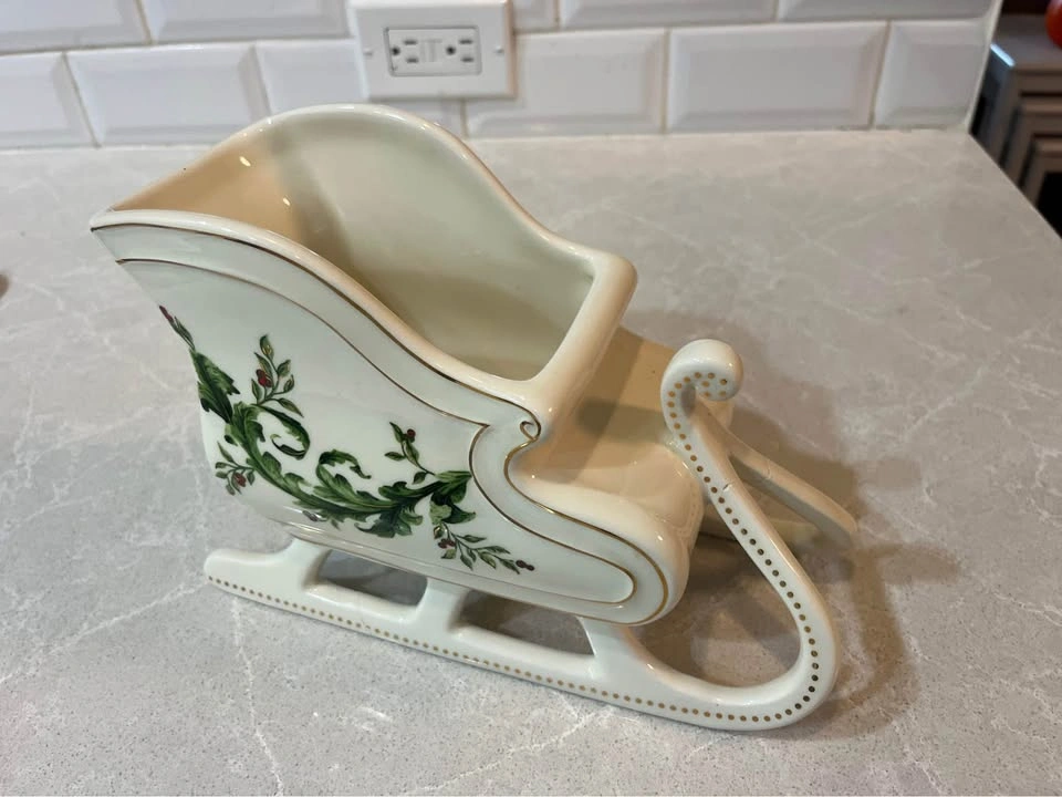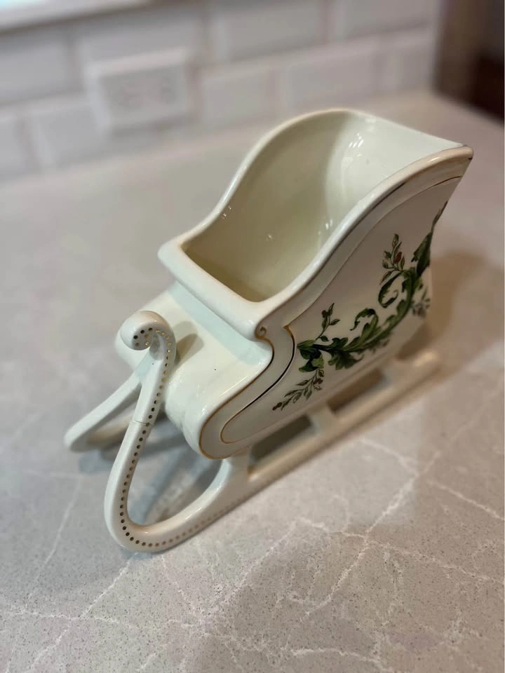 Ceramic Christmas sleigh can be used as a vase. About 10 inches long and 6 inches tall.
