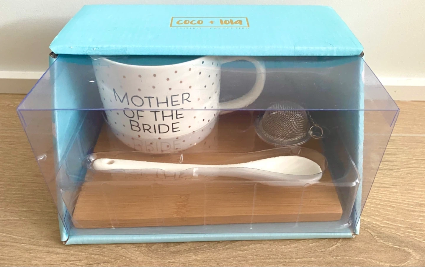 4 piece set Ceramic mug, spoon, tea strainer, bamboo board