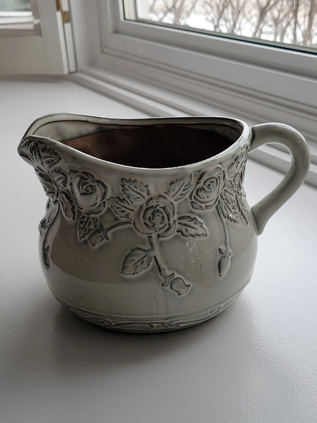 103Excellent Condition Grey Raised Roses 7" x 5.5" mouth 5.5"t $20๐น Firm Fennell and Upper gage Hamilton Pitcher, Jug, Watering Can. Plant Pot. Please see all my listings for Sale