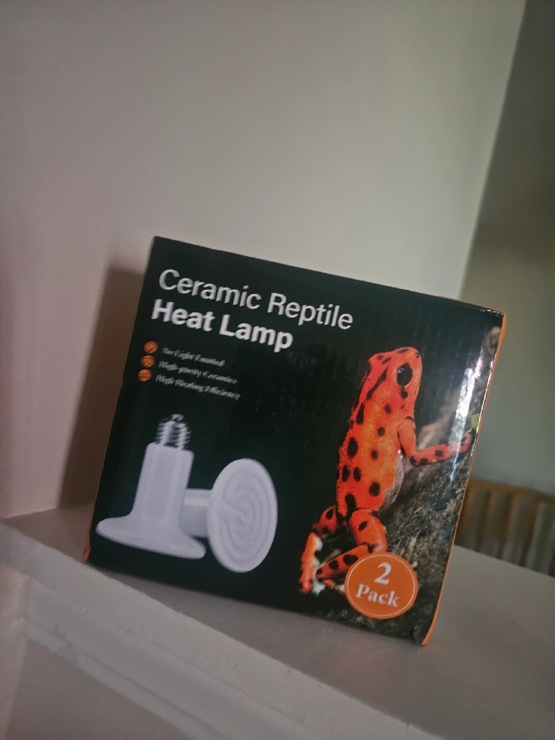 75Selling a 2-pack of ceramic reptile heat lamps! Great for providing heat to your reptile enclosure. The box highlights that they are light emitted, have high-density ceramics, and high heating efficiency