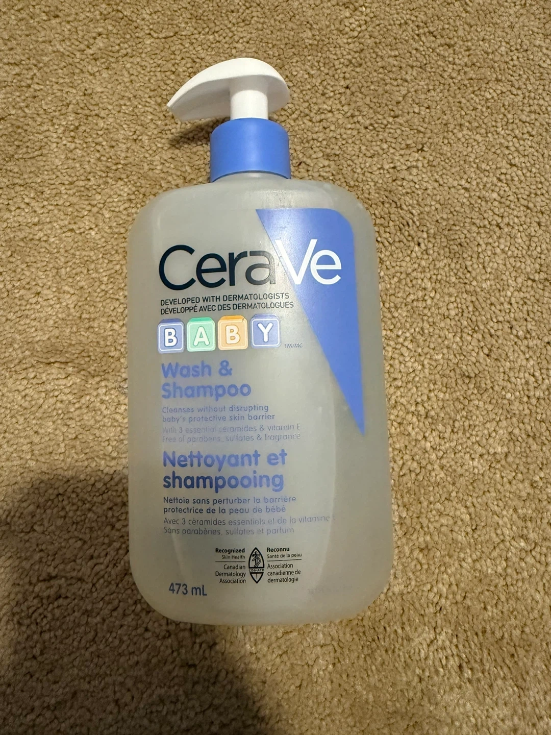 Selling a bottle of CeraVe Baby Wash & Shampoo. It's a gentle, tear-free formula that's hypoallergenic, fragrance-free, paraben-free, and sulfate-free. Perfect for your little one's sensitive skin! The bottle contains 473 ml of product