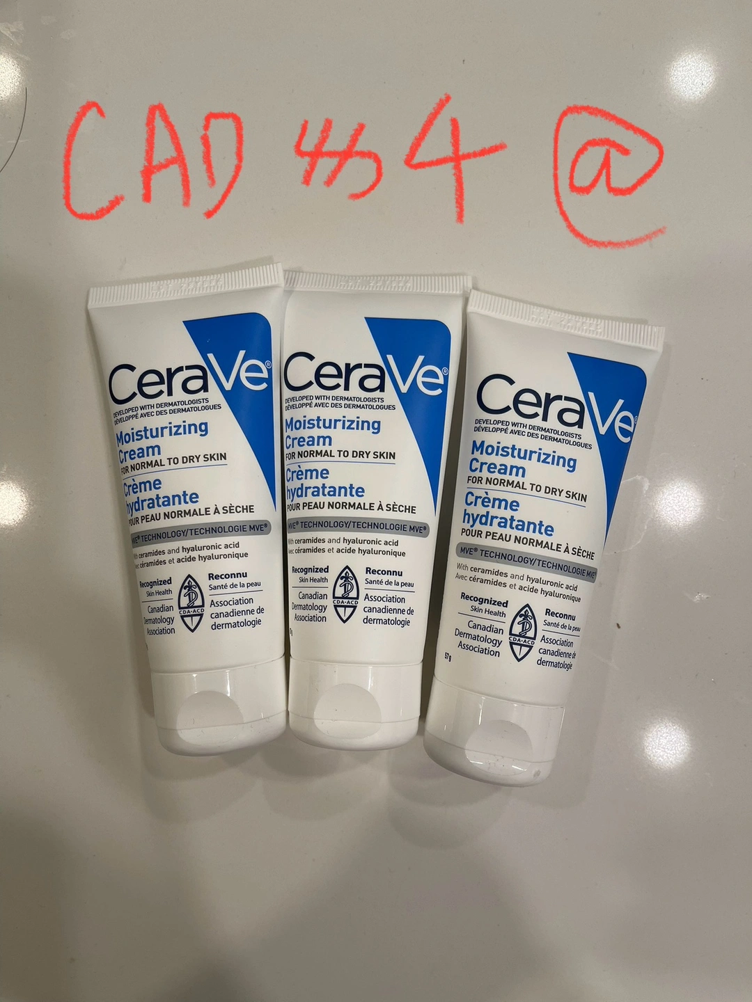 10Selling three tubes of CeraVe Moisturizing Cream! This cream is designed for normal to dry skin and contains ceramides and hyaluronic acid. Each tube is 57g and recognized by the Canadian Dermatology Association