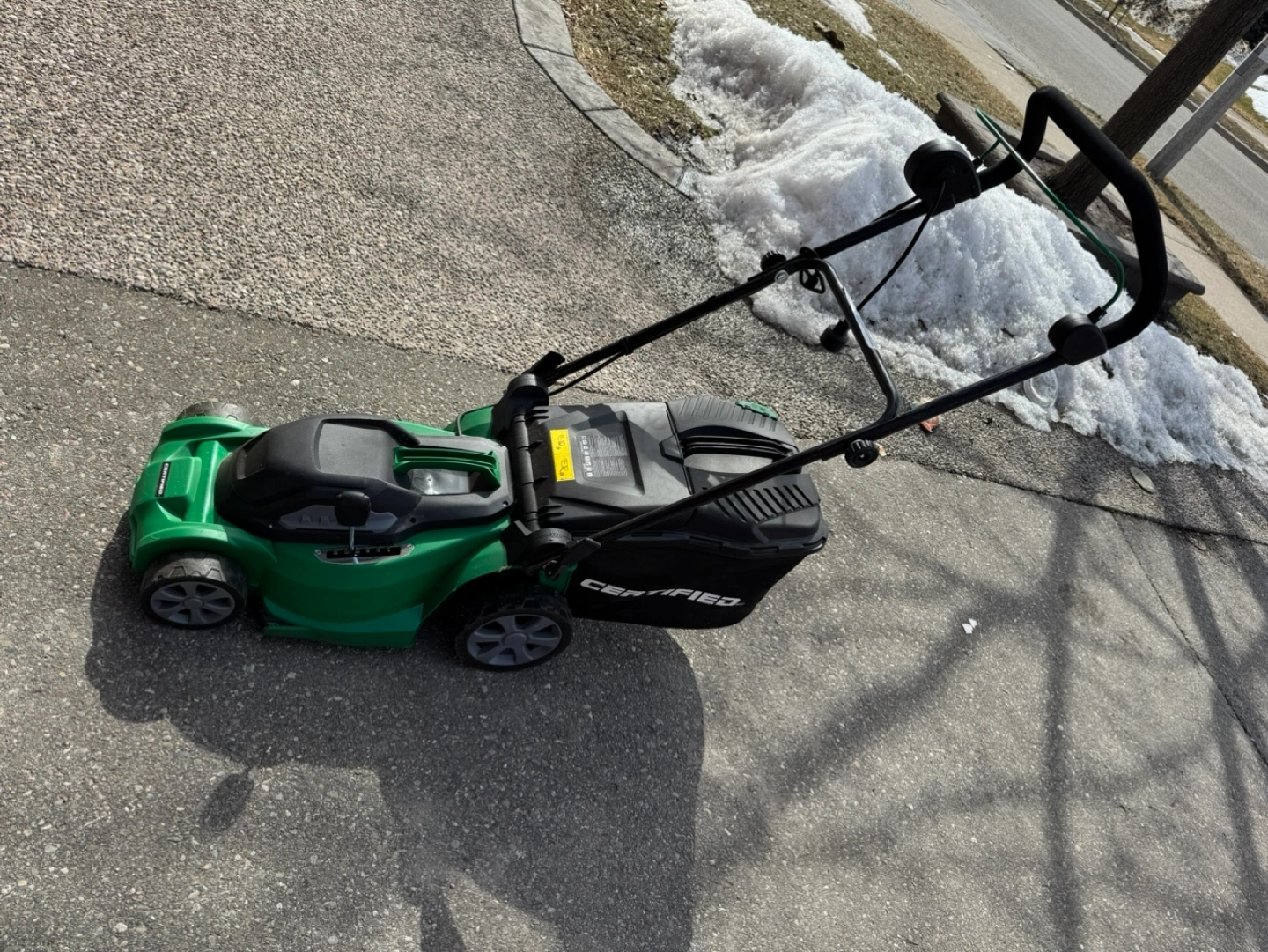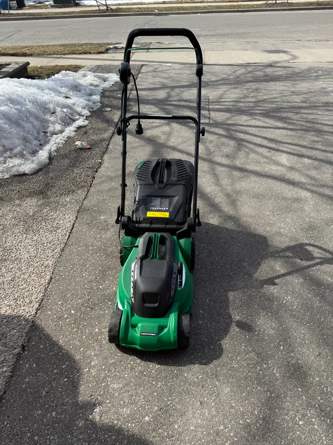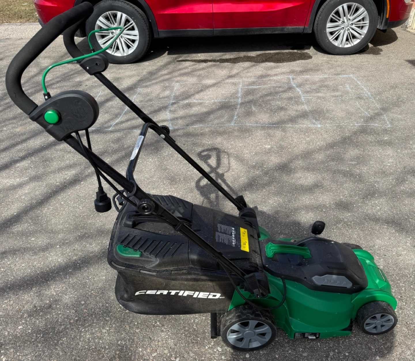 Cordless electric lawnmower. Green and black. Features 3-in-1 functionality. 14-inch cutting deck.