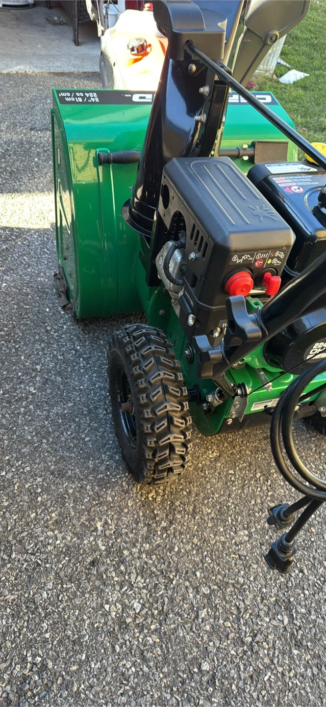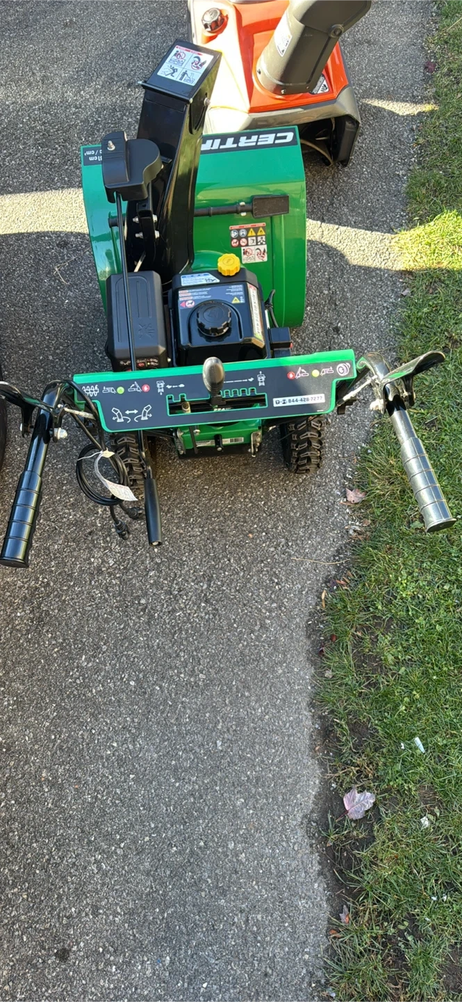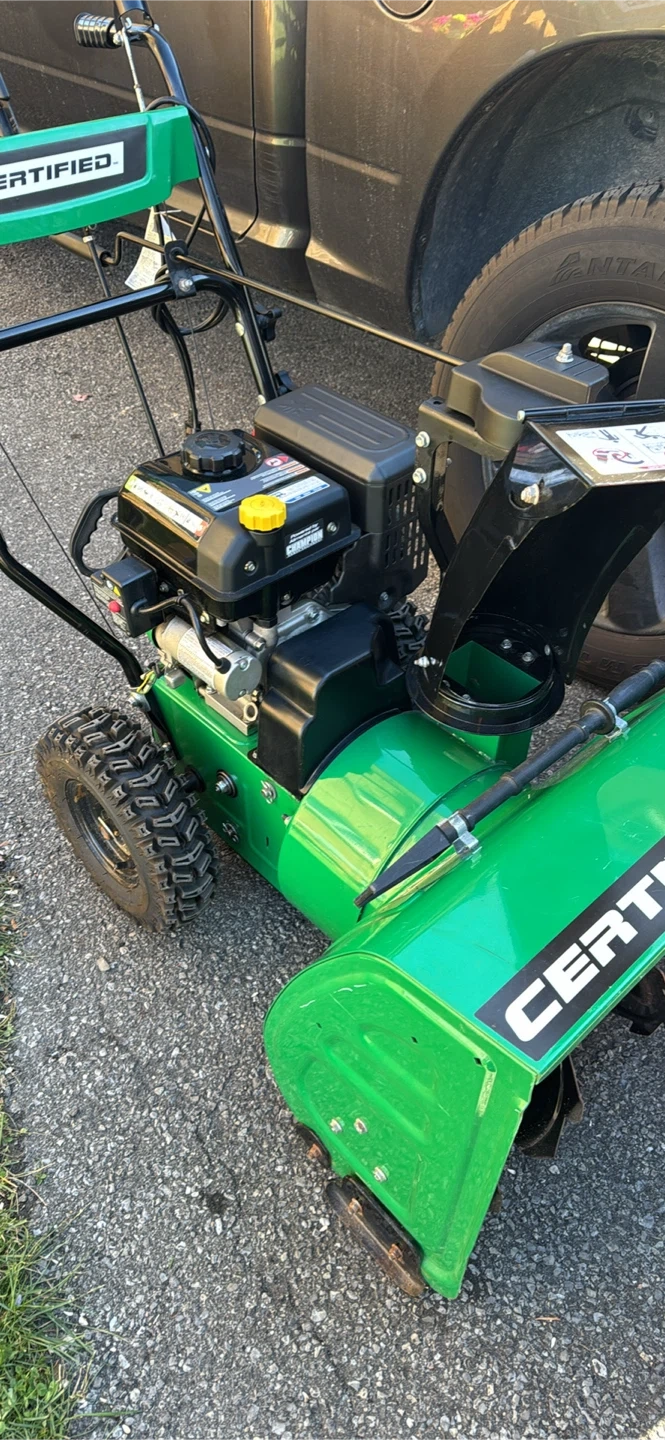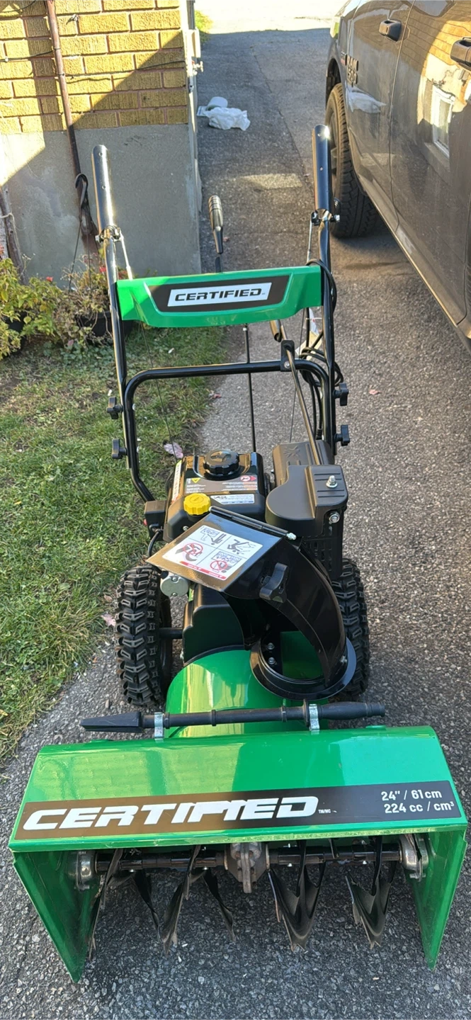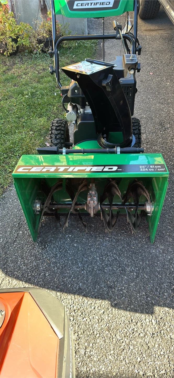 18Selling a Certified snowblower with a 24-inch clearing width and a 224cc engine. It's green and black and ready to tackle some snow this winter! Practically brand new. Freshly tuned up new oil new spark plug