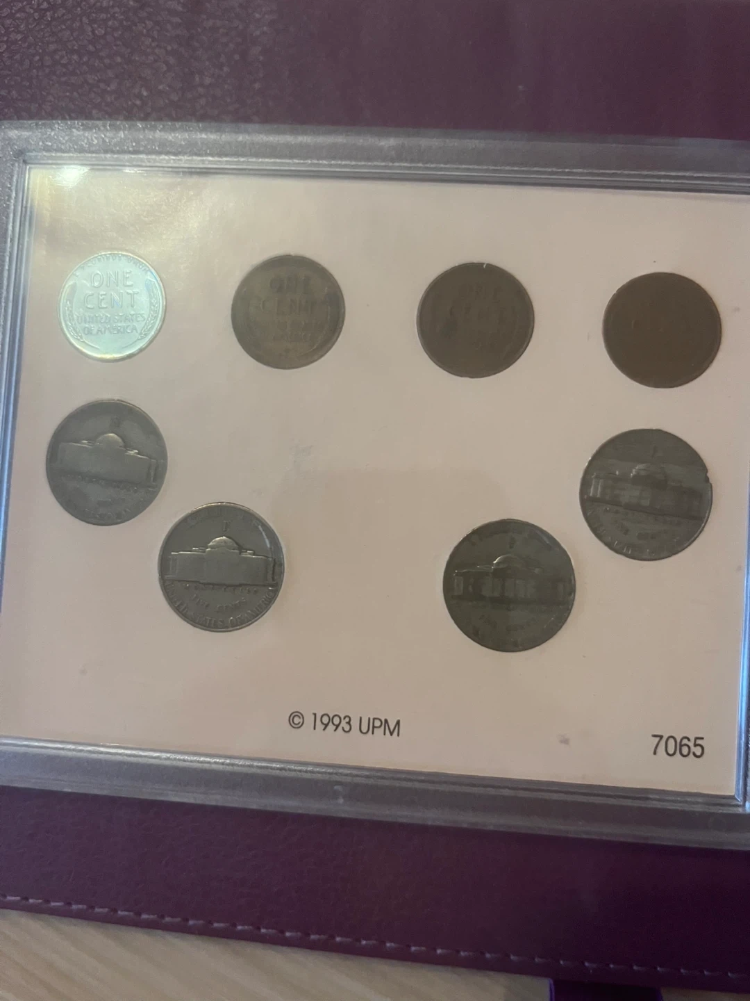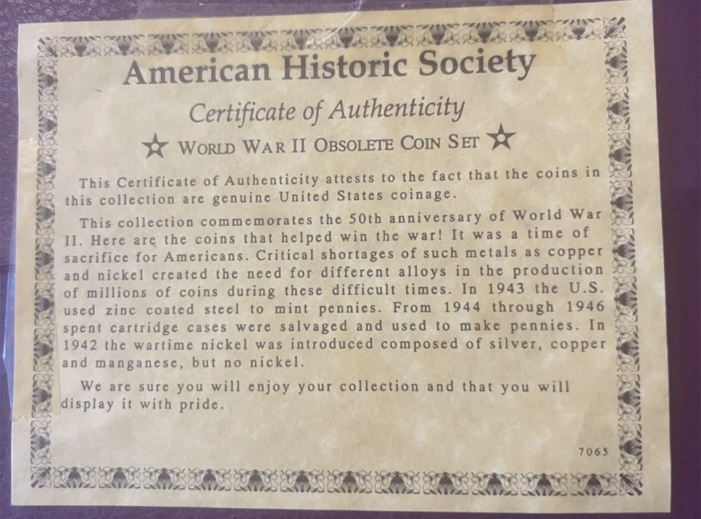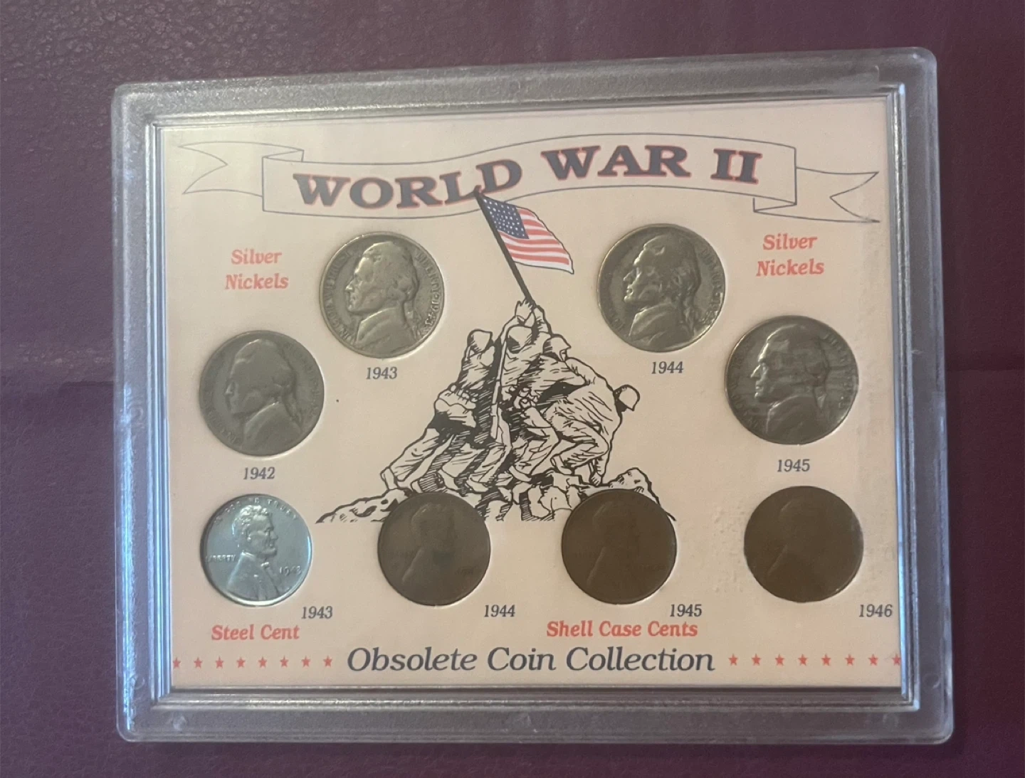 Selling an American Historic Society World War II Obsolete Coin Set. This collection commemorates the 50th anniversary of World War II. It includes coins that helped win the war, made of materials such as copper and nickel. The collection also includes steel and shell case cents